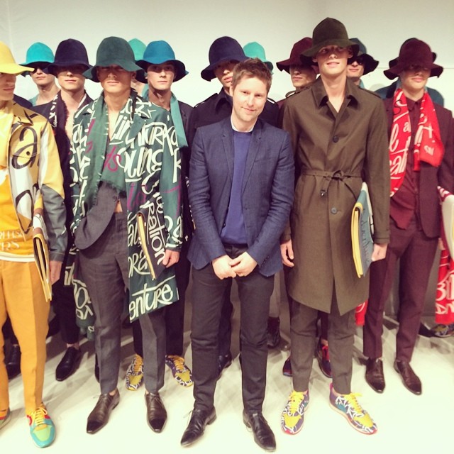 Designer Christopher Bailey poses with models backstage at his latest show for Burberry Prorsum.Pin