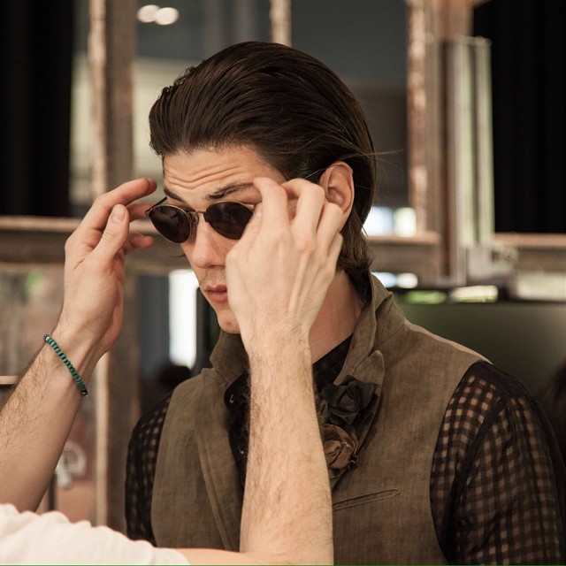 Model Simone Nobili gets new shades at John Varvatos' show during Milan Fashion Week.Pin