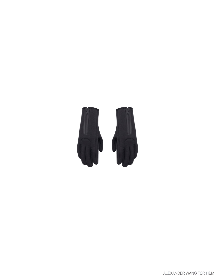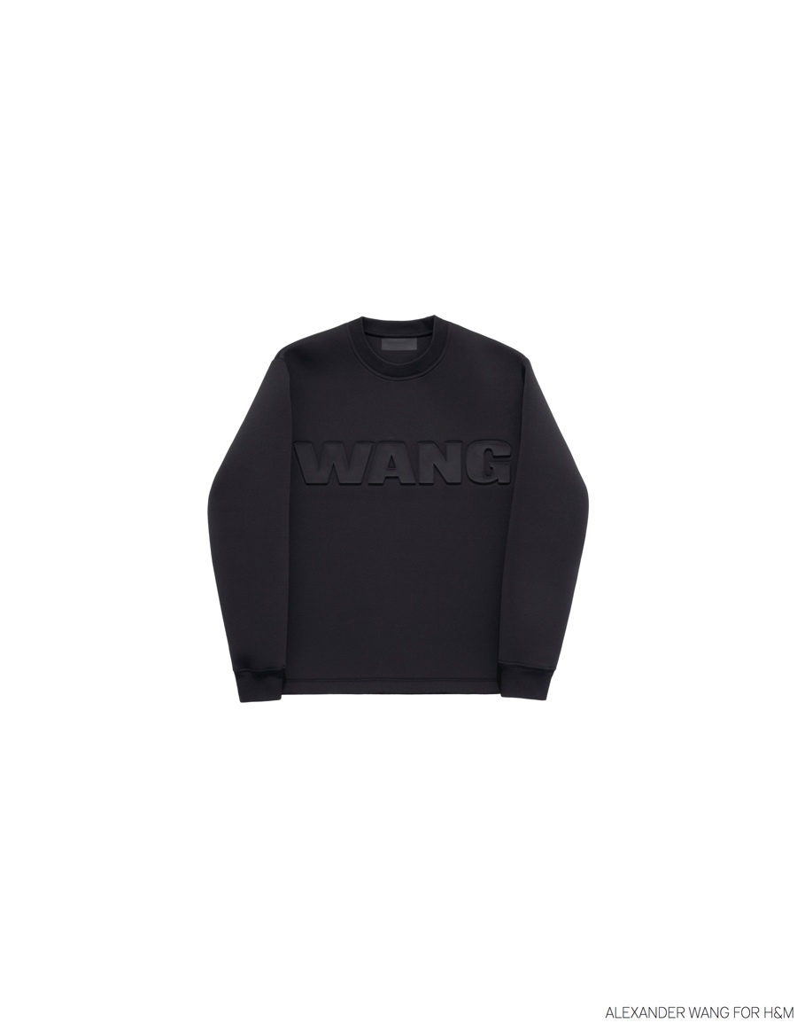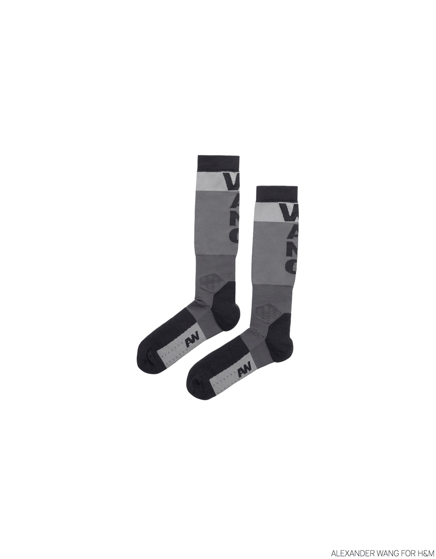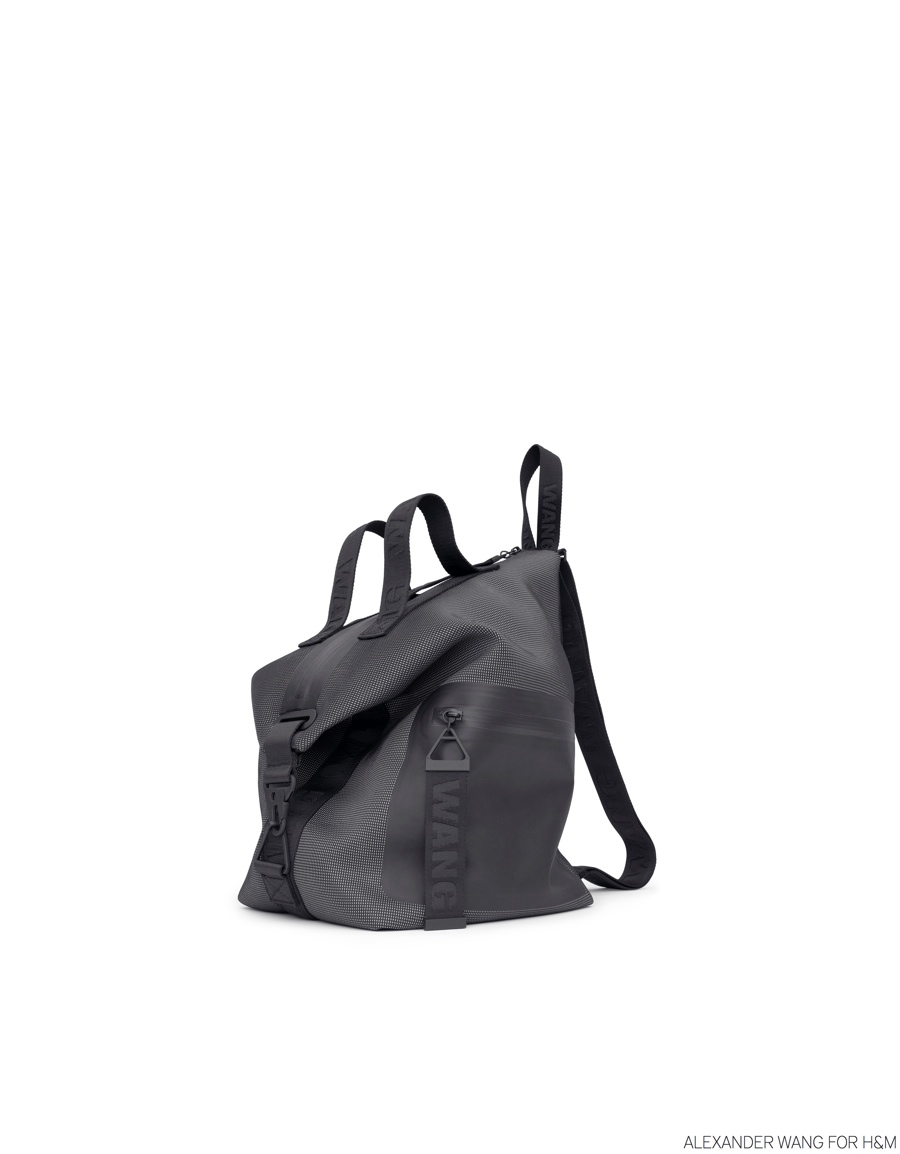 Wang’s performance wardrobe for H&M is completed with black scuba gloves, jacquard beanies and graphic branded compression socks. Footwear includes a hybrid black scuba sneaker, with the logo stamped in reflective print across the zipper, and a hi-top zip-front leather sneaker. A padded nylon duffel comes with branded webbing straps, while backpacks are available in black leather or mesh with a hidden nylon ‘shower cap’ for rain protection.