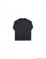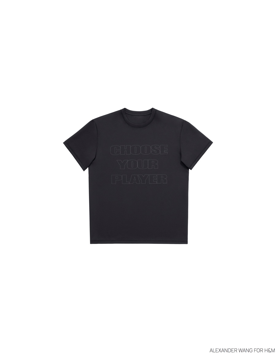Sport influences runs throughout the collection, especially a seamless quick drying T-shirt perforated with a hidden message that becomes apparent when worn. An arrow graphic performance tank is branded with Wang in silver mesh, while performance shorts are branded with the Wang logo across the front. There is also a colorblock and appliqued leather baseball shirt and sports knit leggings branded at the waistband and knee.
