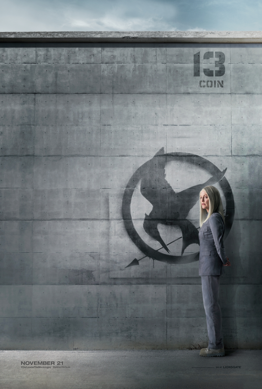 Shades of Gray-Momentum builds for the November 21st release of ‘The Hunger Games: Mockingjay – Part 1’ as new posters are released for District 13. TheCapitol.PN was hacked by the rebel underground to reveal the District 13 Citizen posters, which feature courageous leaders President Coin, Finnick, Plutarch, Beetee, Effie and Haymitch. Adventurous and stylish, the heroes wear shades of gray, delivering modern urban looks. In other news, Peeta Mellark is still a chic captive in white.