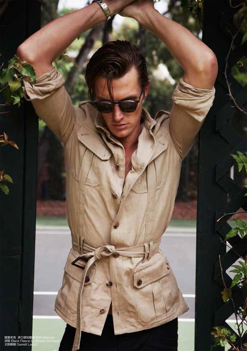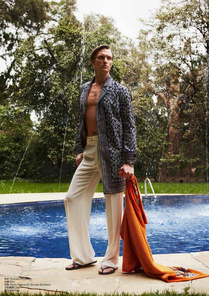 Hollywood Glamour–For the July issue of Chinese GQ, photographer Kate Orne and stylist Rika Noda try to recreate the glamorous life of Hollywood’s golden age, capturing model Shaun DeWet in a series of luxurious summer designs. Decked out in pieces from the likes of Burberry Prorsum, Calvin Klein Collection and others, the Ford New York model spends quality time with laps in the pool or reading his latest script under the sun, alternating luxurious designs, with sportswear inspired ensembles.