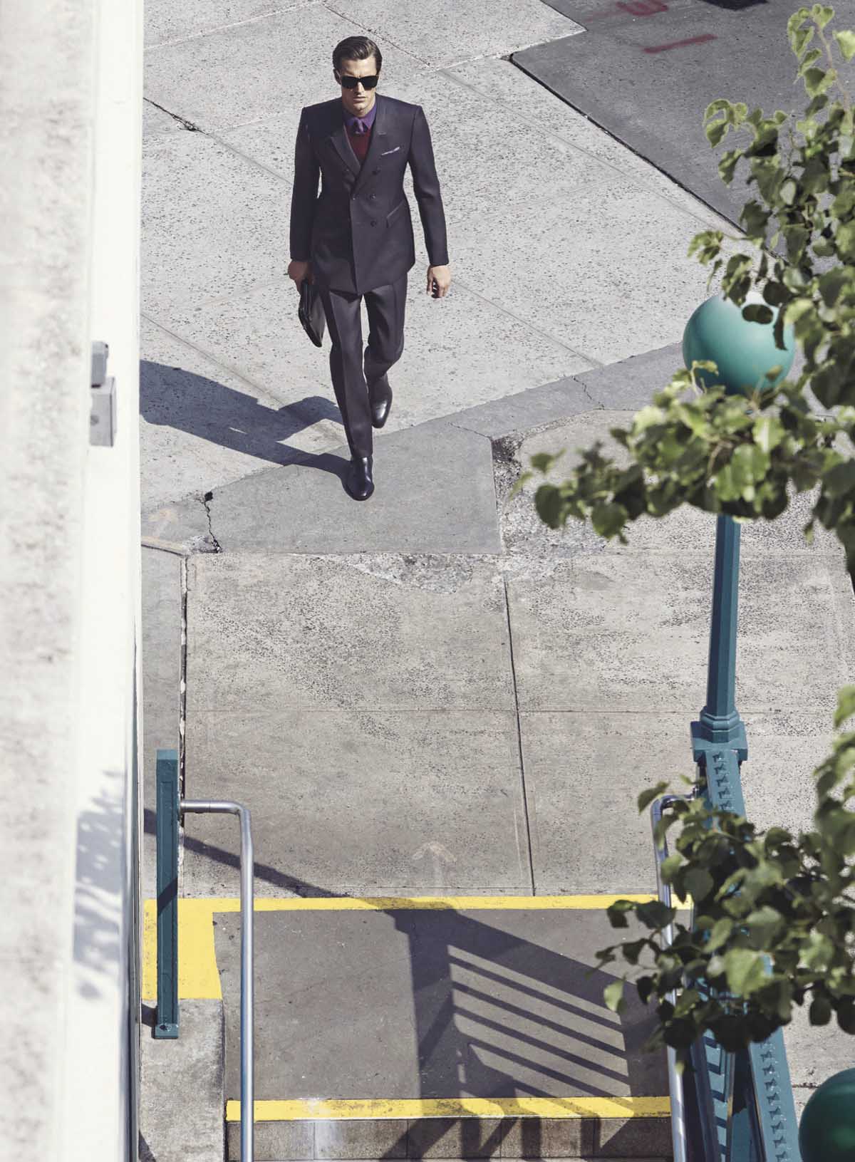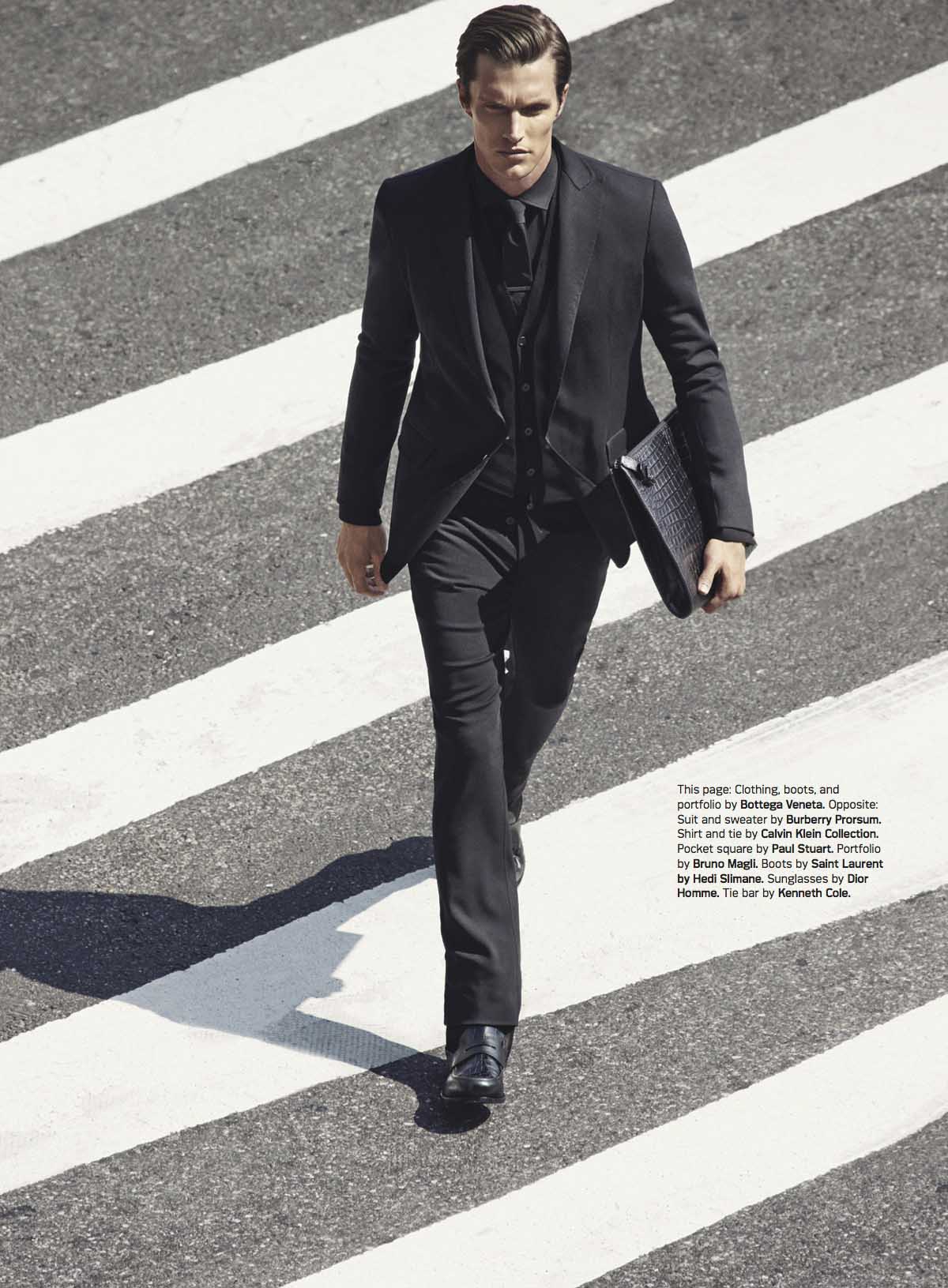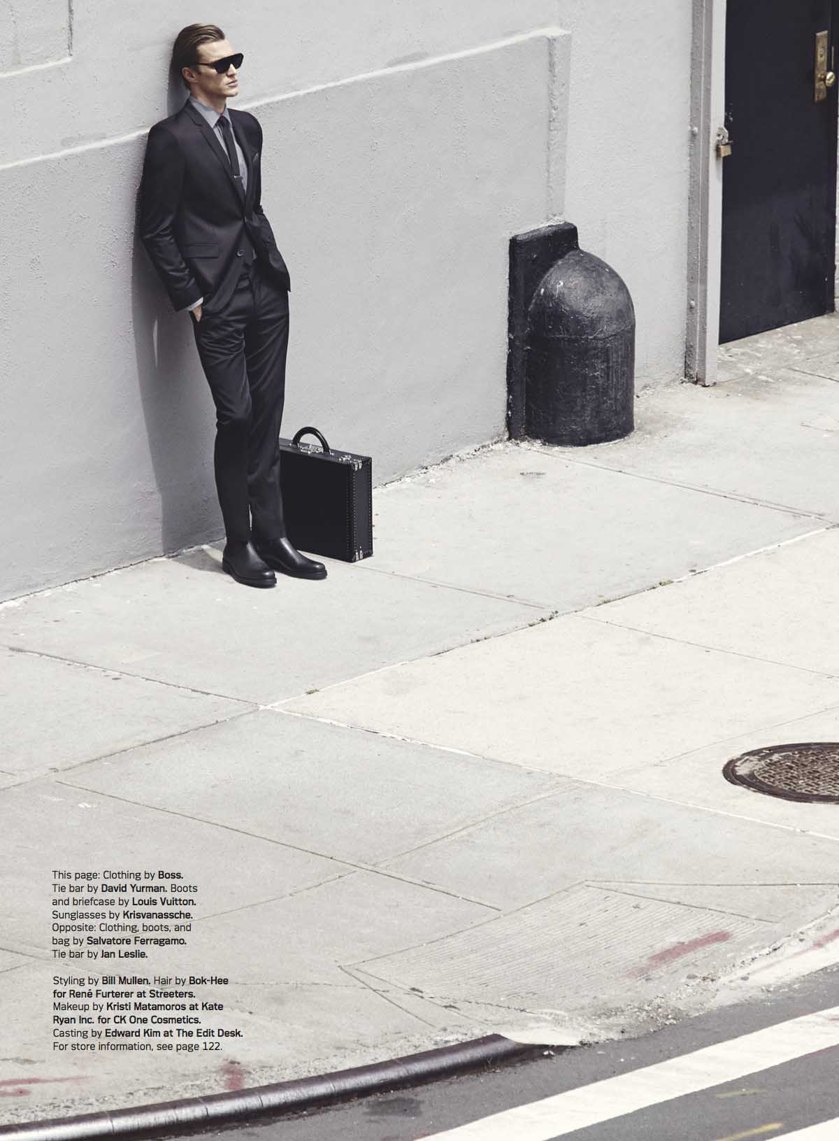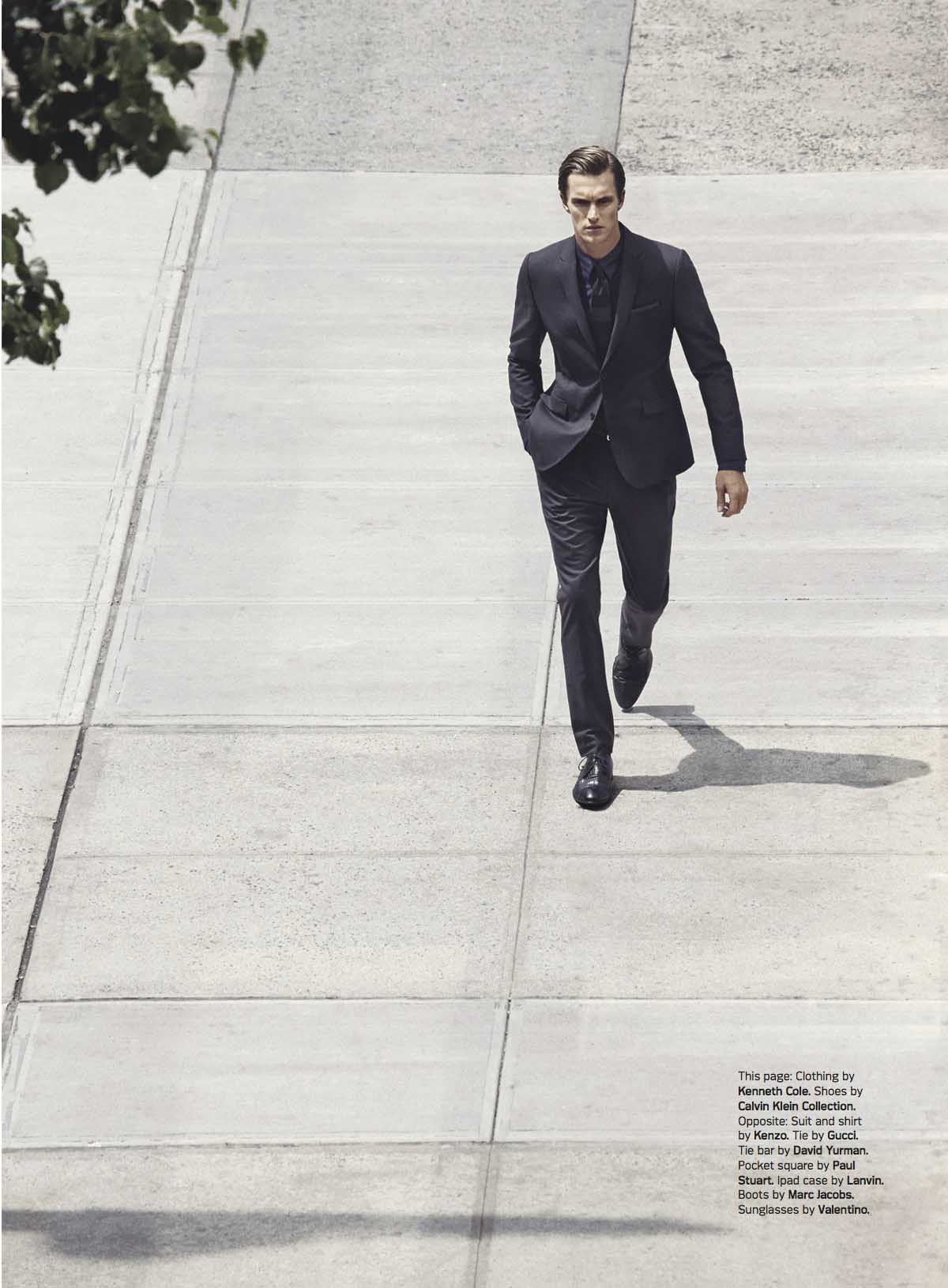 Power Dressing–The suit, the business uniform par excellence, gets quite a minimal oriented makeover for the fall season, as displayed by this story, lensed by Robbie Fimmano for the September issue of Details. Ford New York model Shaun DeWet walks in the streets of New York City wearing a selection of flawless suits, including pieces from the likes of Salvatore Ferragamo and Canali, pulled together by stylist Bill Mullen. Once again, the accessories are the pieces that complete and add personality to the whole styling, like luxurious crocodile portfolios, sleek iPad cases and dark sunglasses. / Hair by Bok-Hee. Makeup by Kristi Matamoros.