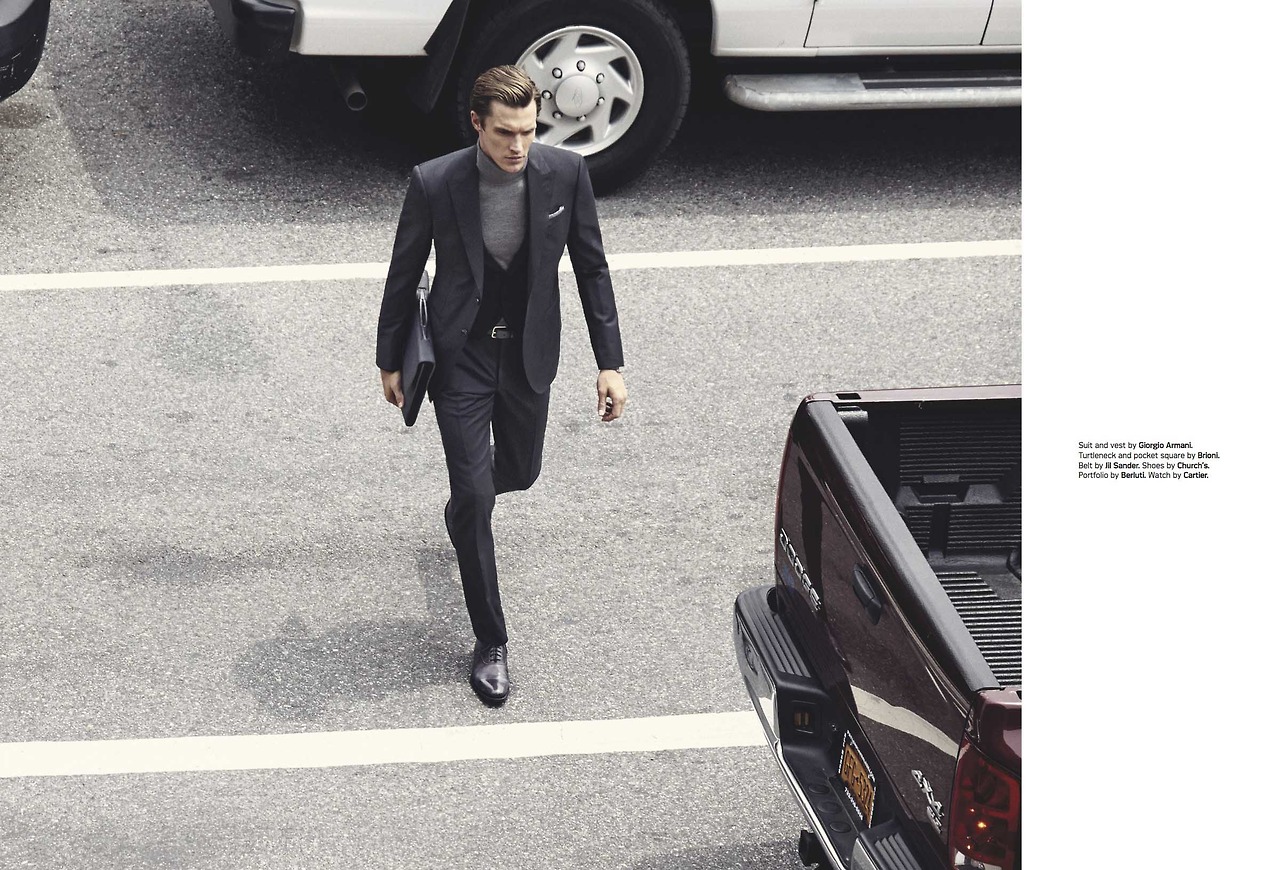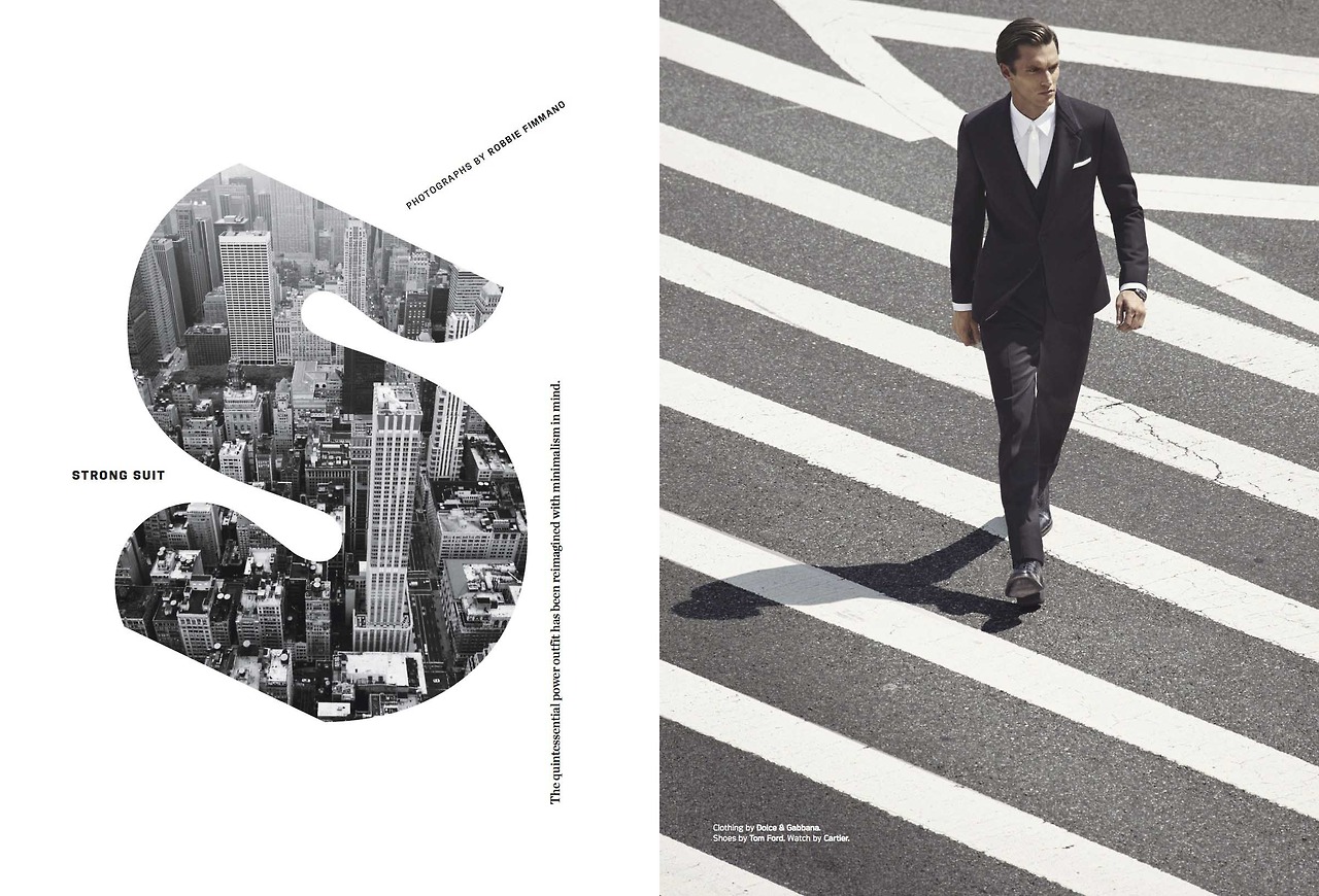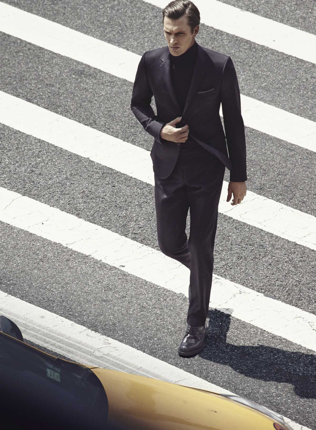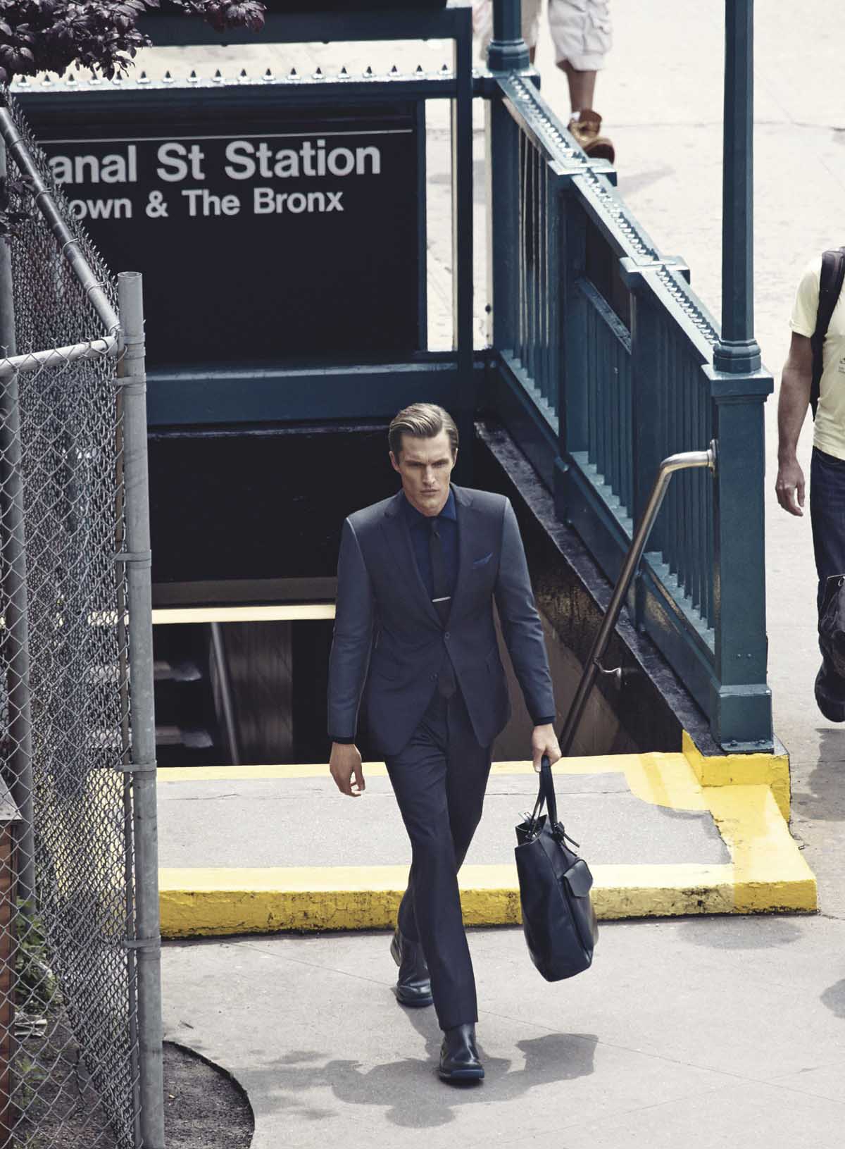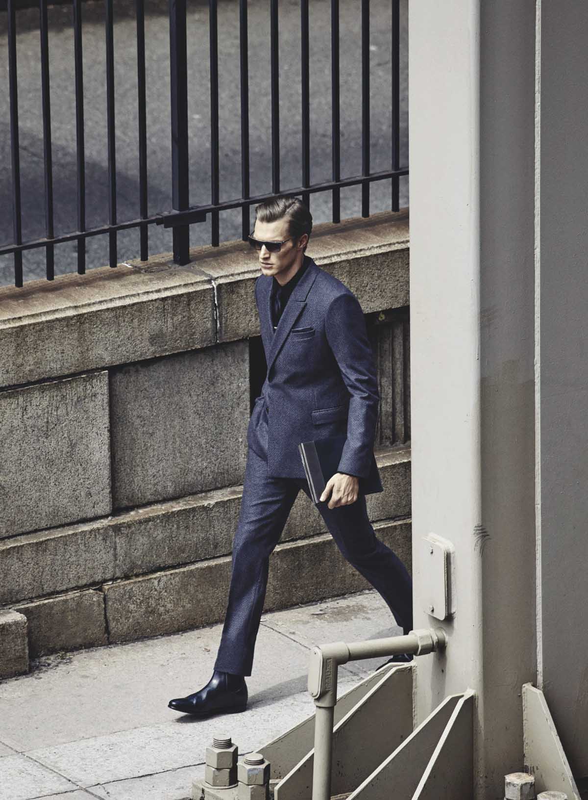 Power Dressing–The suit, the business uniform par excellence, gets quite a minimal oriented makeover for the fall season, as displayed by this story, lensed by Robbie Fimmano for the September issue of Details. Ford New York model Shaun DeWet walks in the streets of New York City wearing a selection of flawless suits, including pieces from the likes of Salvatore Ferragamo and Canali, pulled together by stylist Bill Mullen. Once again, the accessories are the pieces that complete and add personality to the whole styling, like luxurious crocodile portfolios, sleek iPad cases and dark sunglasses. / Hair by Bok-Hee. Makeup by Kristi Matamoros.