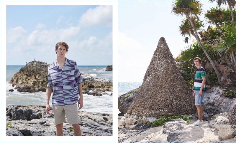 PinLeft: Tim Dibble models a Berluti polo with Connolly striped trousers and Marni leather sandals. Right: Taking to the beach, Tim sports a Lanvin printed shirt with Onia striped swim shorts.