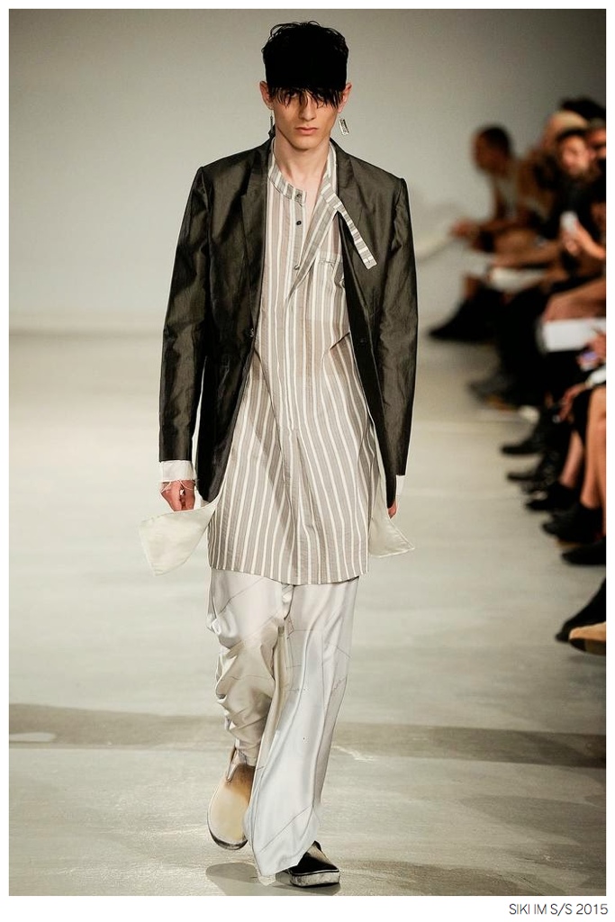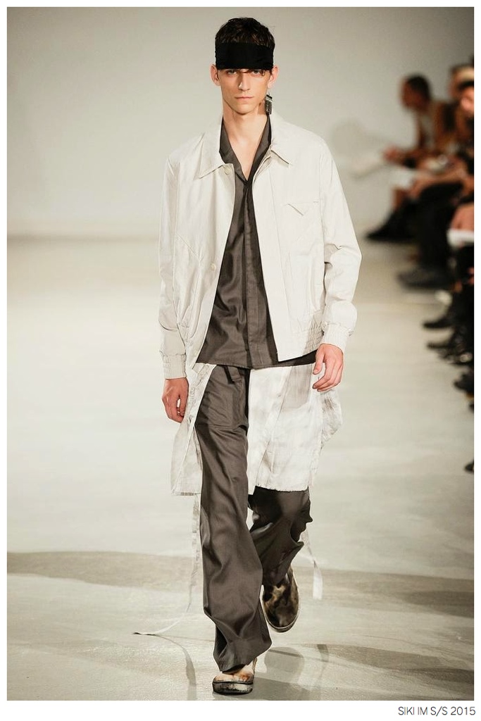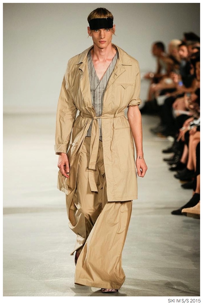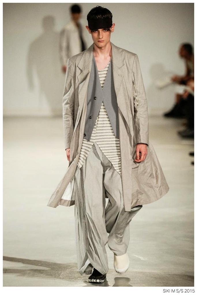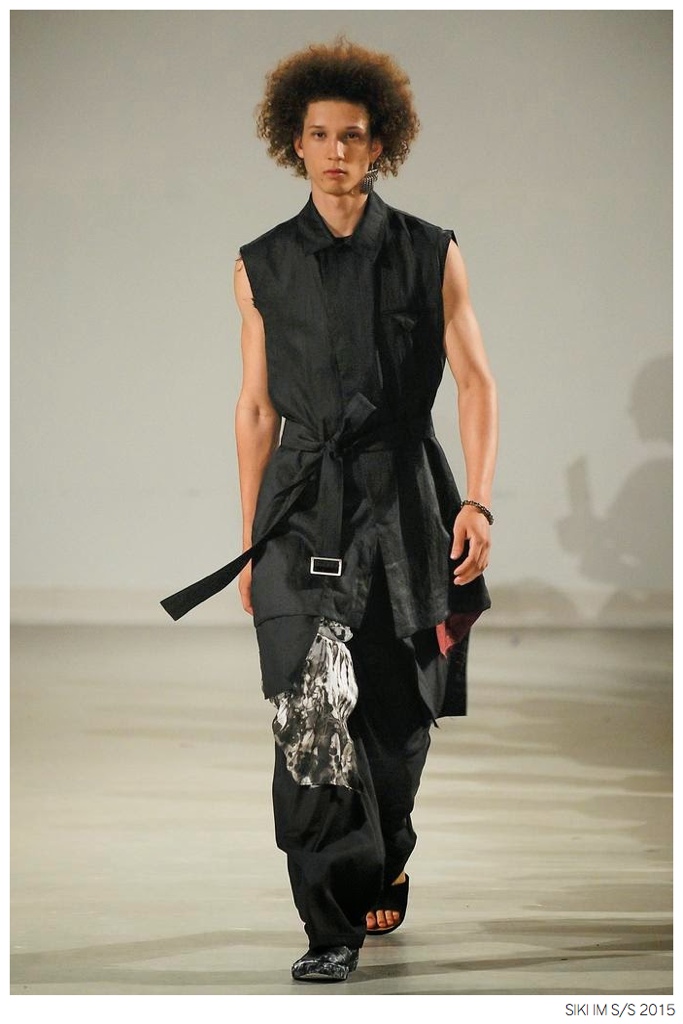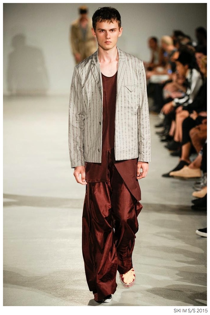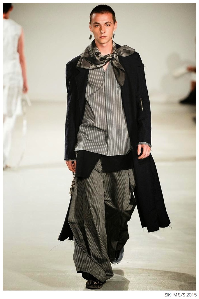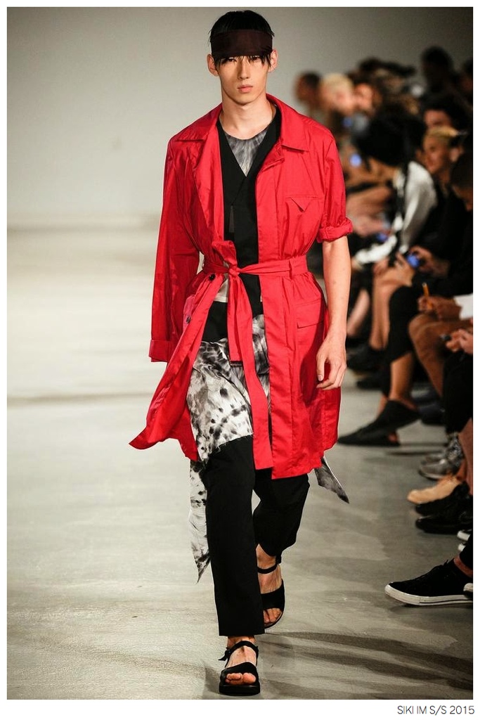 Siki Im Spring/Summer 2015-Not one to maintain the status quo, Siki Im disrupted the sea of fitted silhouettes that have been shown during New York Fashion Week, opting for a more voluminous variety. Layering lightweight pieces and draping kimono-inspired shapes, Siki Im presented a casual outing for his man. Long, airy coats were met with billowing wide-cut trousers. Peeking out from jackets, many tops were cut asymmetrical, while cinched but open coats added to the collection’s refreshing sense of movement.