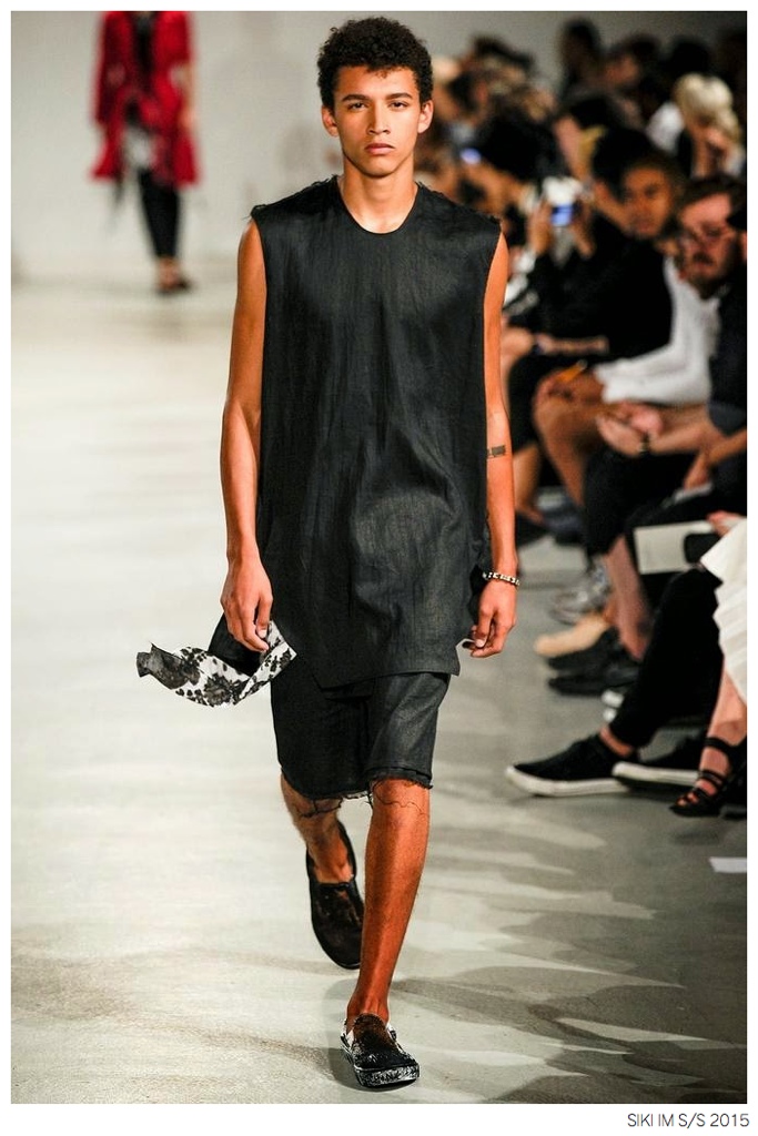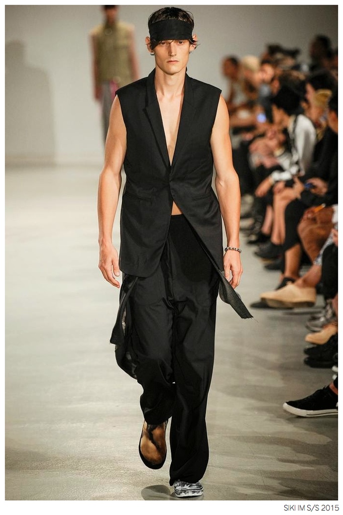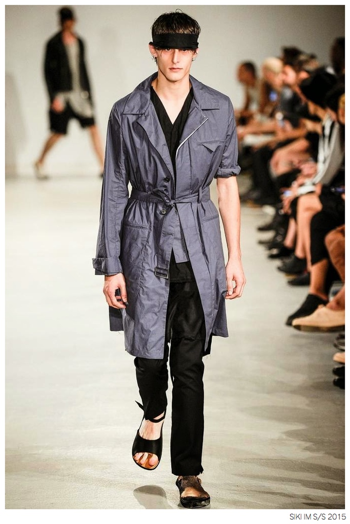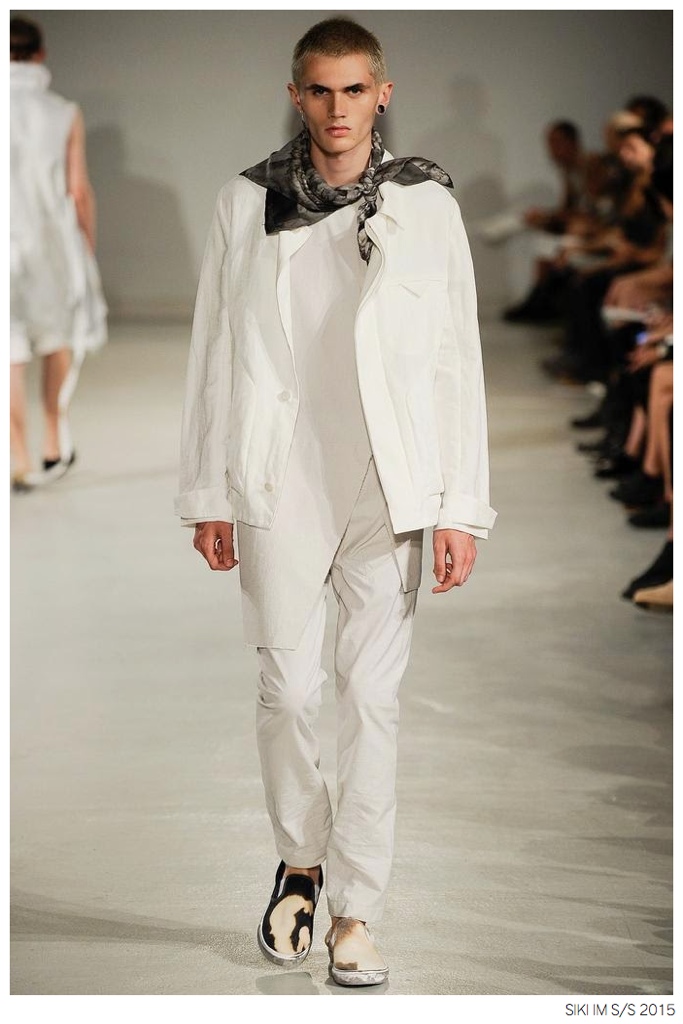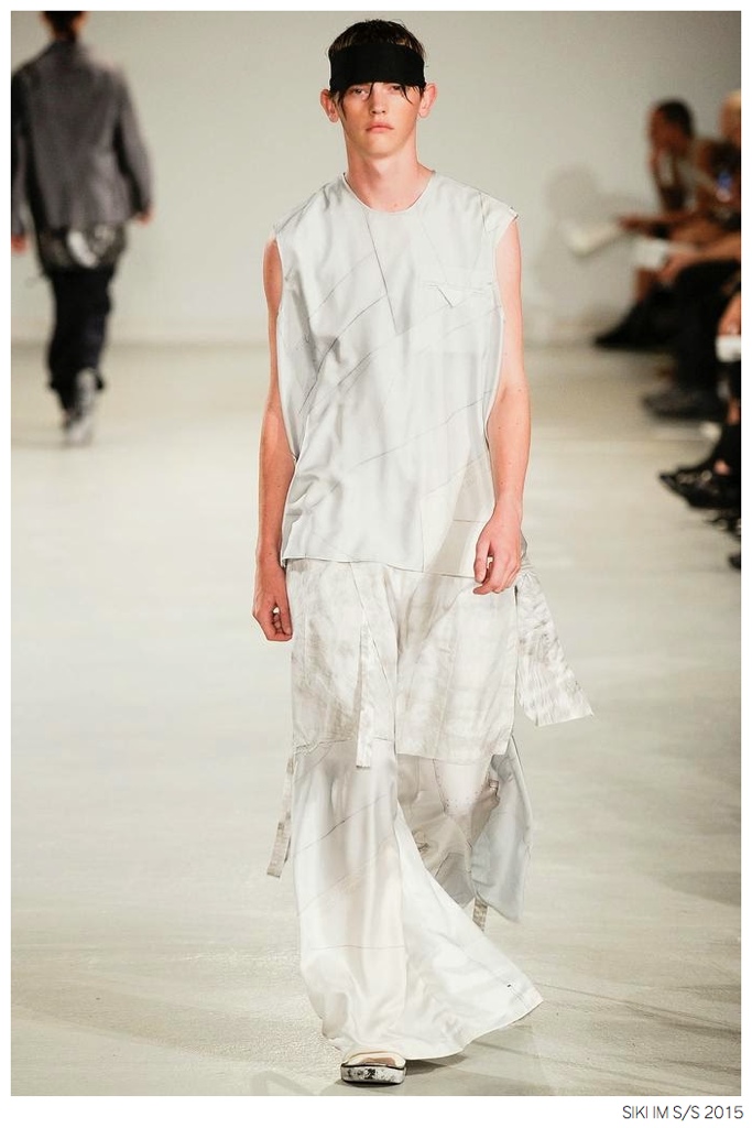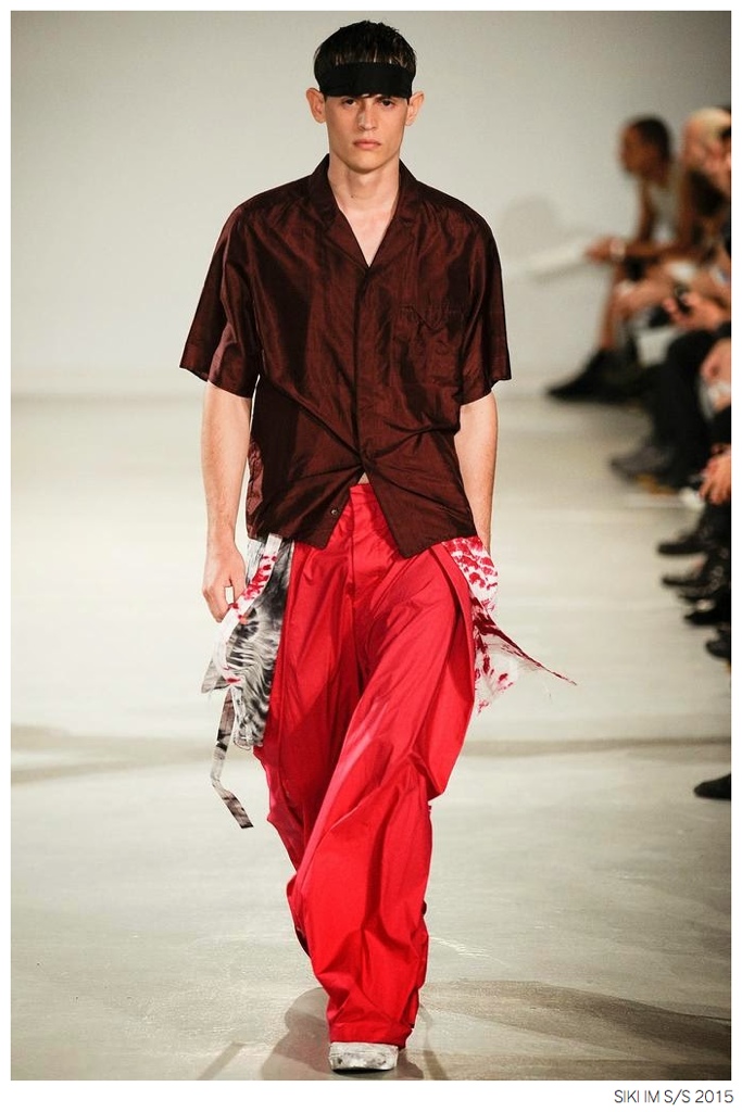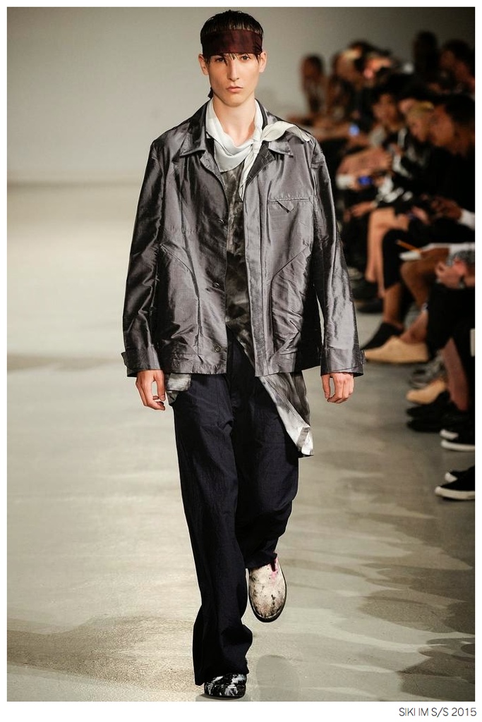 Siki Im Spring/Summer 2015-Not one to maintain the status quo, Siki Im disrupted the sea of fitted silhouettes that have been shown during New York Fashion Week, opting for a more voluminous variety. Layering lightweight pieces and draping kimono-inspired shapes, Siki Im presented a casual outing for his man. Long, airy coats were met with billowing wide-cut trousers. Peeking out from jackets, many tops were cut asymmetrical, while cinched but open coats added to the collection’s refreshing sense of movement.