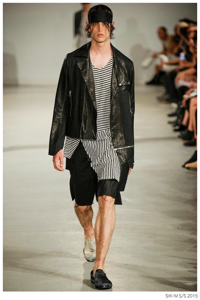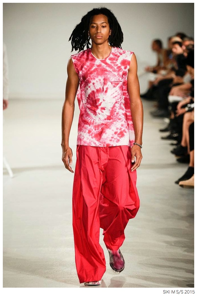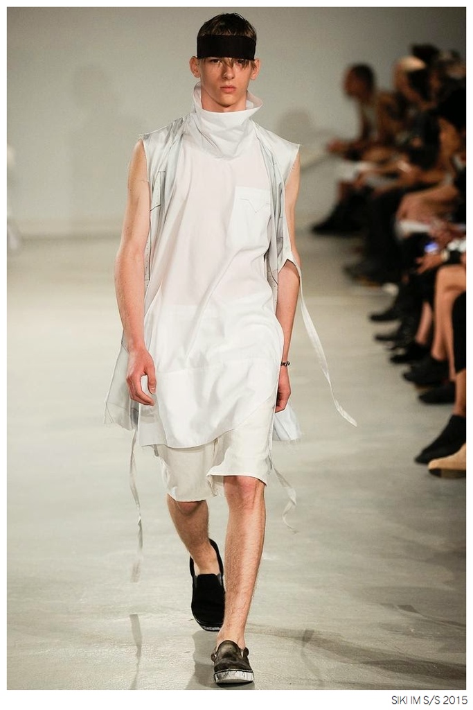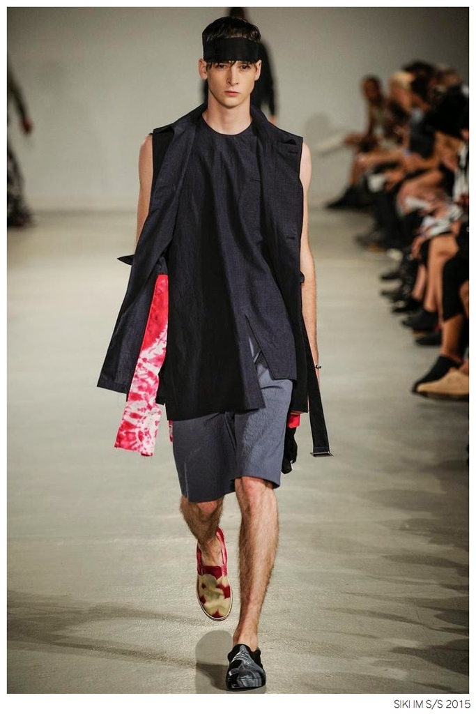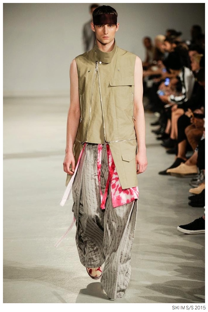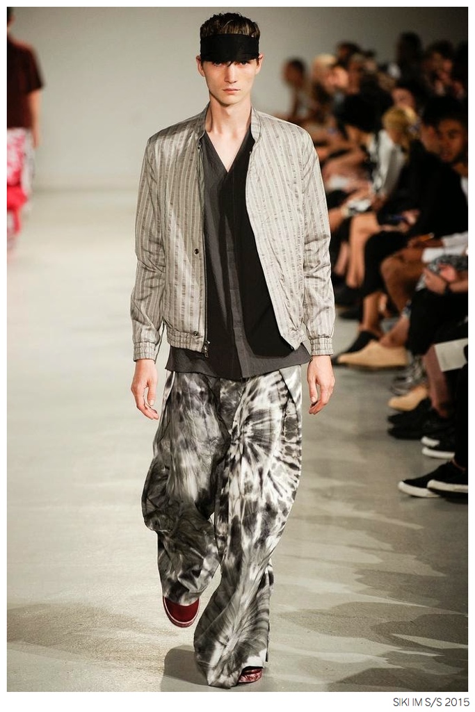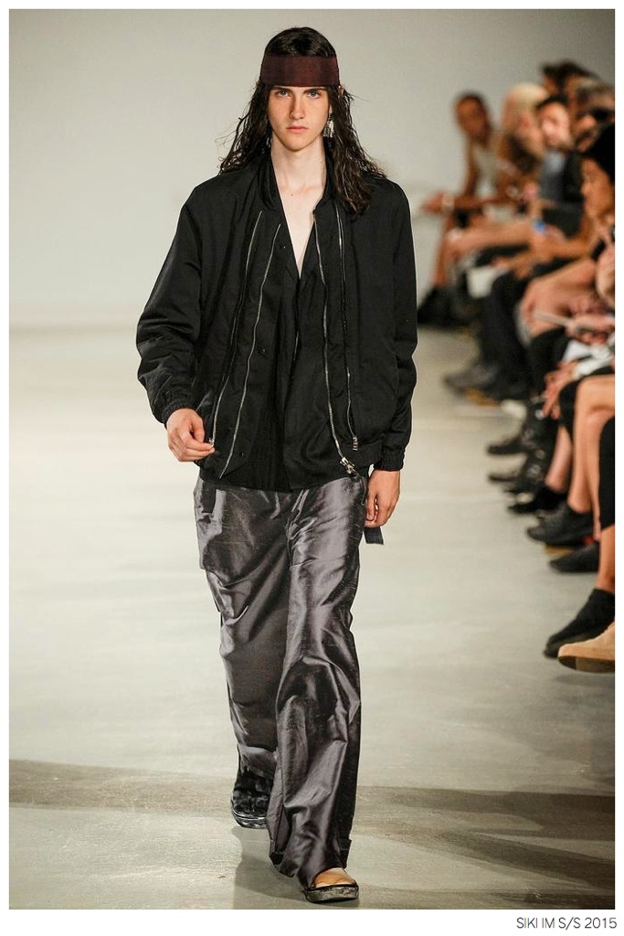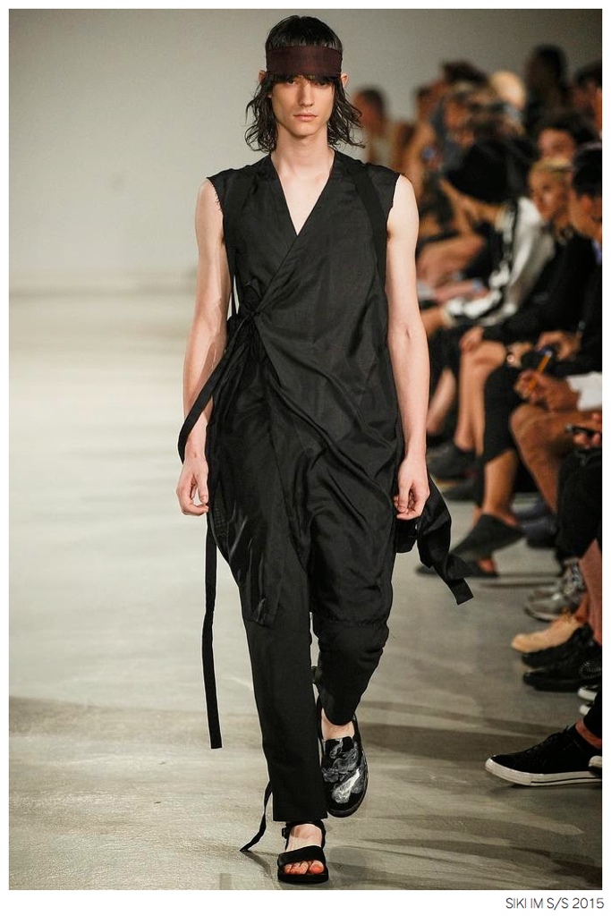 Siki Im Spring/Summer 2015-Not one to maintain the status quo, Siki Im disrupted the sea of fitted silhouettes that have been shown during New York Fashion Week, opting for a more voluminous variety. Layering lightweight pieces and draping kimono-inspired shapes, Siki Im presented a casual outing for his man. Long, airy coats were met with billowing wide-cut trousers. Peeking out from jackets, many tops were cut asymmetrical, while cinched but open coats added to the collection’s refreshing sense of movement.