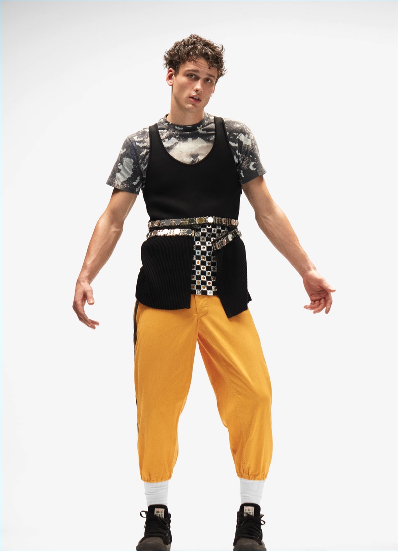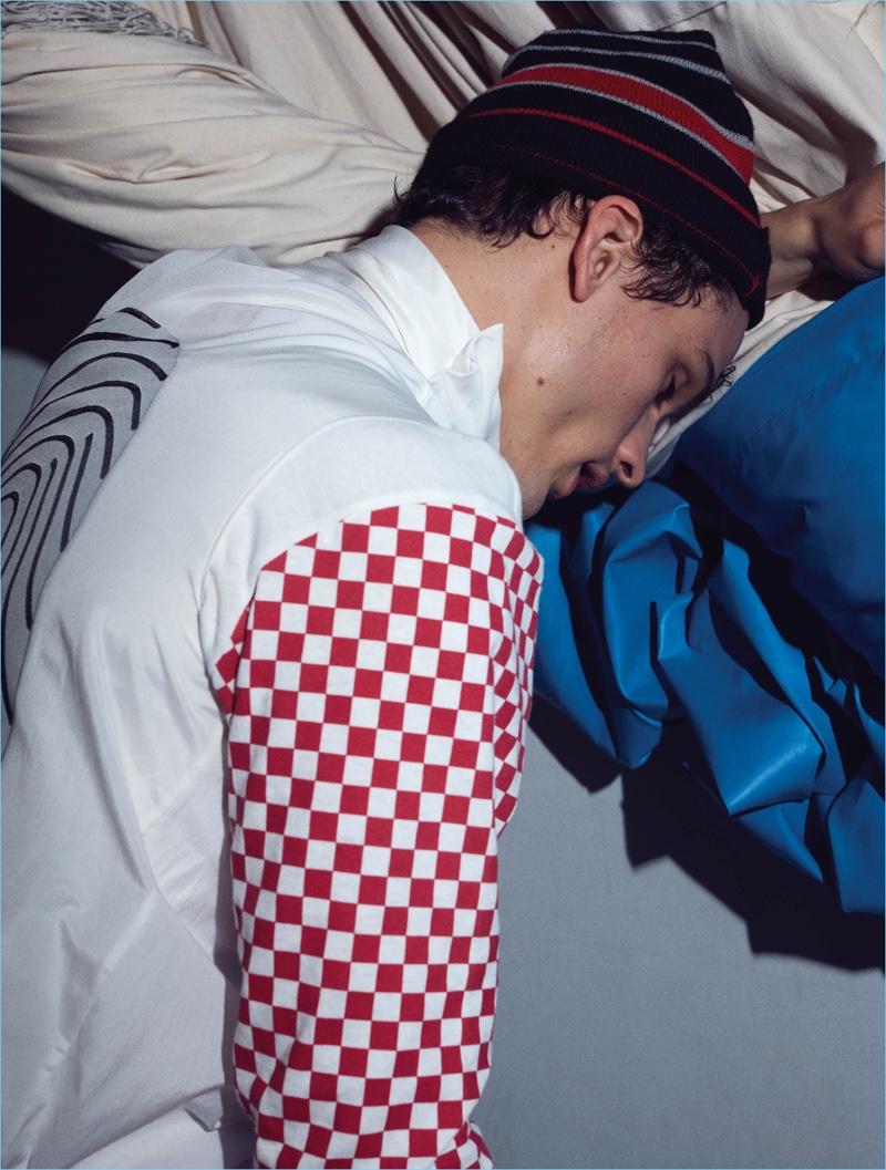 Tom Guinness pulls pieces from his own archives and juxtaposes them with fresh spring styles for a quirky fashion story. The stylist outfits Simon Nessman for the occasion. Benjamin Alexander Huseby photographs the Canadian model for VMAN’s spring-summer 2017 issue. Embracing a sporty motif, Simon brings an unrelenting calm to a wardrobe of Versace, Balmain, and more.