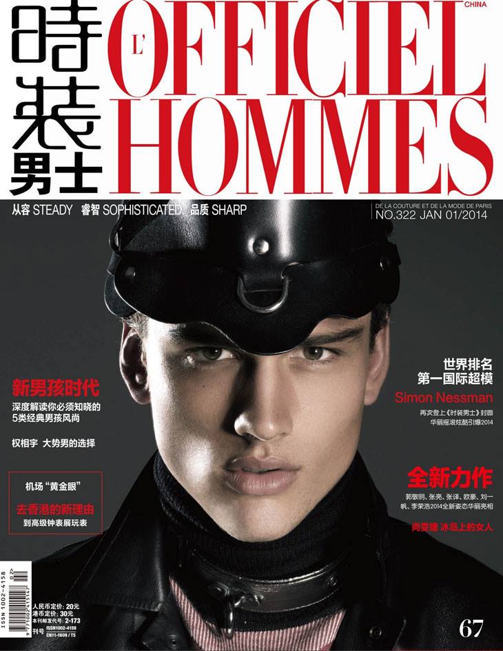 Look at Me–The face of Michael Kors’ spring/summer 2014 campaign, Canadian model Simon Nessman is photographed by Jun Liu for the January cover of L’Officiel Hommes China. Styled by Brett Bailey in black leather numbers with a bondage vibe, Simon poses for a striking close-up shot. / Hair by Joey George.