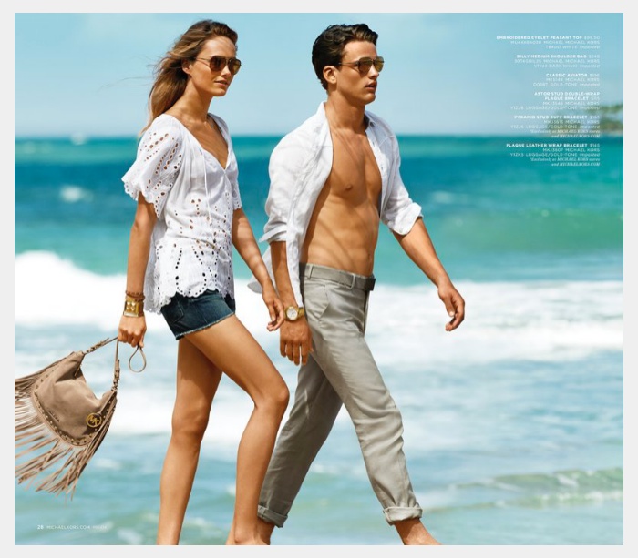 Michael Kors Summer Catalogue–Canadian model and a regular face of Michael Kors, Simon Nessman joins the brand for its summer catalogue. Joined by Karmen Pedaru, Simon is a man on the go, taking in exotic sites for a summer getaway. Sporting a refined style, aided by relaxed essentials, Simon is captured in slim trousers, crisp white shirts, knitwear, swimsuits and timeless accessories that include sunglasses, bags and watches. Simon also appears in Michael Kors’ spring/summer 2014 campaign, photographed by Mario Testino.