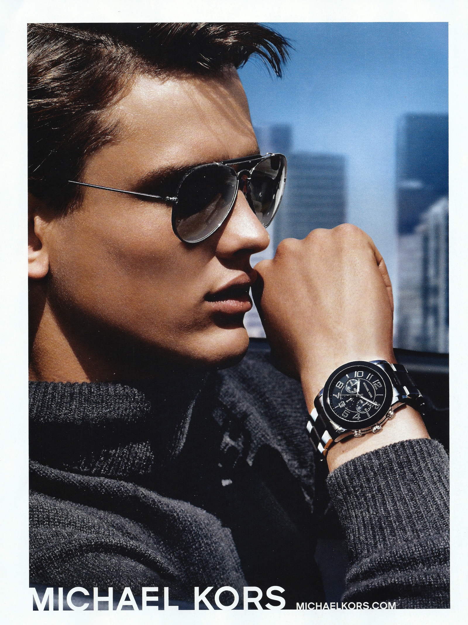 Ongoing Appeal–With a series of successful Michael Kors campaigns under his belt, Canadian model Simon Nessman continues his lucky relationship with the American fashion designer, appearing in the newly released advertisements for Kors’ fall/winter 2013 sunglasses and timepieces collections. Captured once more by photographer Mario Testino against a modern skyline, Simon stuns in this profile close-up, wearing a luxury sweater from Kors’ fall collection, paired with metallic aviator sunglasses and a performing chronograph.