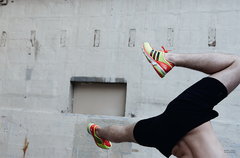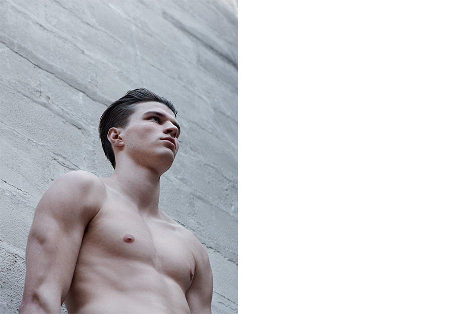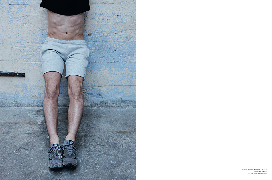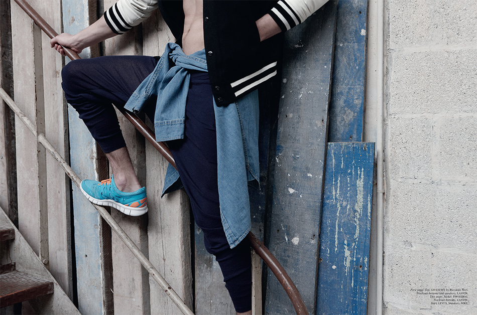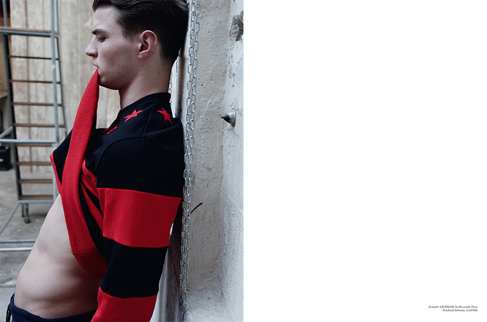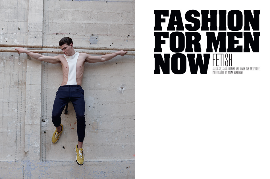 A Fetish for Sportswear–Fashion for Men’s latest issue features a story, lensed by Milan Vukmirovic, focused on sportswear, but conceived in an unexpected way. This time, this specific kind of style is intended as a real fetish for active guys, and not as a simple way of dressing for the usual gym session. Serving both as photographer and stylist, with the help of regular contributor Scarlett Viquel, Vukmirovic sets his sights on models Simon Van Meervenne, Sacha Legrand (Major Paris) and Arran Sly (Models 1), capturing them in a spare setting, where cement walls and rusted scaffoldings surround the models’ dynamic poses. Clad in luxurious numbers, like Givenchy’s striped jumpers, the boys also display a selection of performing sneakers, like the one designed by Adidas and New Balance, that support them during their intense workout sessions. / Styling assistance by Natalia Sultanova. Hair by Massimo Gamba (Atomo Management).