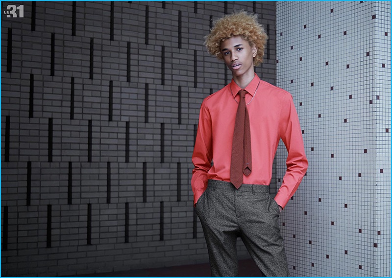 Model Michael Lockley dons a red stretch shirt and tone-on-tone stripe tie with flared 70s-inspired trousers from LE 31.