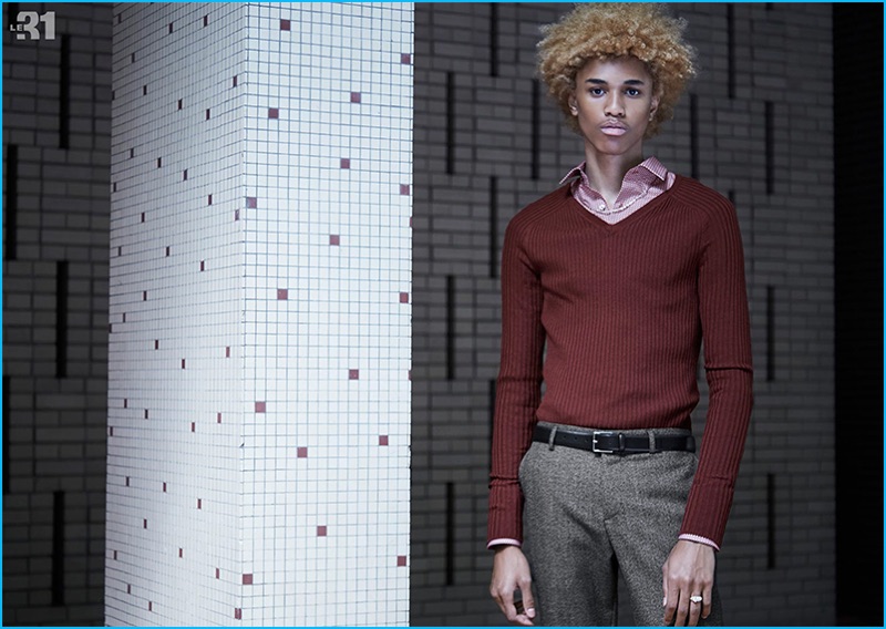 Channeling a retro flair, Michael Lockley dons a red ribbed-knit v-neck sweater, brown tailored shirt, and micro-houndstooth trousers from LE 31.Pin