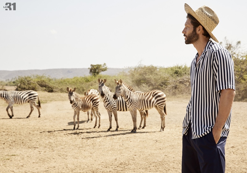 PinModels John Halls and Bruna Tenório come together for Simons’ summer 2017 catalogue. John sports a LE 31 striped seersucker jacket with a polo and chinos.PinPosing with Zebras, John Halls and Bruna Tenório model the latest from Simons. John wears a LE 31 chambray suit with a Fred Perry polo.