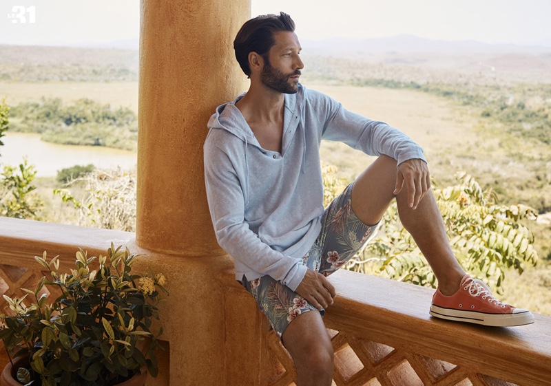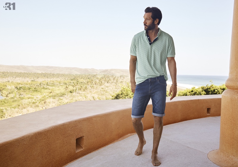 PinModel John Halls dons a LE 31 linen-knit henley sweater and Levi’s white 511 jeans.PinSporting preppy style, John Halls wears a Lacoste L!ve piqué polo shirt with LE 31 braided belt chino Bermudas.