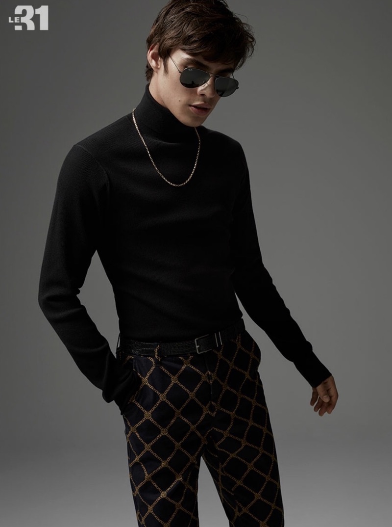 Model Louis Baines sports a LE 31 turtleneck sweater with ornamental pattern pants, a leather belt, and Ray-Ban sunglasses.Pin