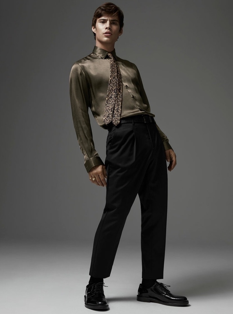 Front and center, Louis Baines dons a LE 31 satiny shirt, gold leaf tie, and anti-fit trousers.Pin