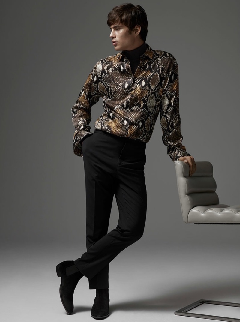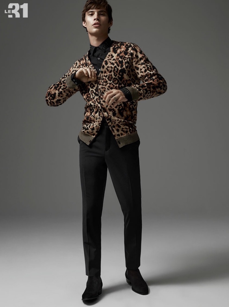 Making a case for animal prints, Louis Baines wears a LE 31 leopard print cardigan with an adorned shirt, and tuxedo pants.Pin