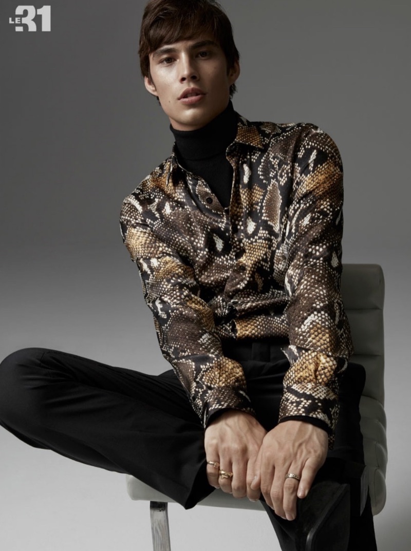 Simons embraces over the top regal style with a new fall lookbook. Channeling a bold flair with “Baroque Decadence,” model Louis Baines hits the studio. The wardrobe comes together in a black color palette with elegant gold accents. LE 31 provides for a sharp fashion trend with ornate prints and contemporary fits. Louis wears statement pieces, which range from longline printed shirting and all-over printed trousers to a statement leopard print cardigan.