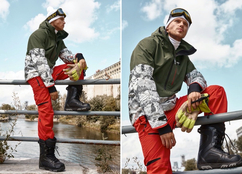 PinPictured left, Matthew Noszka wears a down coat by Helly Hansen. Right: Stepping out in Fire + Ice, Matthew Noszka dons a 3D puffer coat with camo pants and a sherpa jacket.PinReady for snowboarding, Matthew Noszka models an Orage 3-in-1 insulated coat with bib pants.