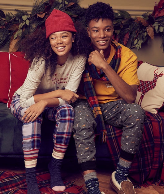 Nora Mejdouli and Robbie Beeser don pajamas for Simons' holiday 2019 campaign.Pin