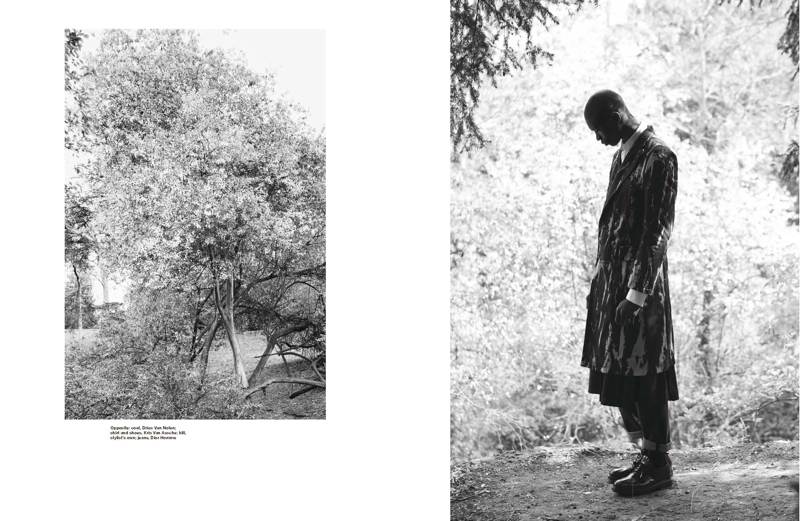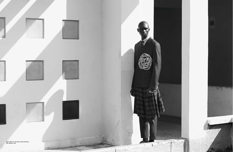 Stand & Watch–Stylist Mauricio Nardi plays with the idea of men in skirts for a new editorial featured in Dapper Dan. Photographed by Johan Sandberg, Fernando Cabral is the model of choice as he heads outdoors for a black & white shoot. Standing at attention, the Fusion model is captured in dark designs by Dior Homme, Maison Martin Margiela, KRISVANASSCHE and other fashion brands.