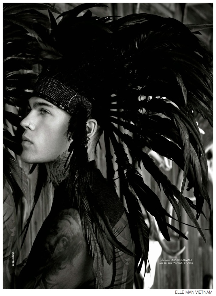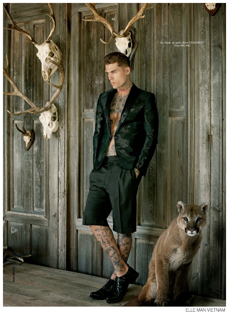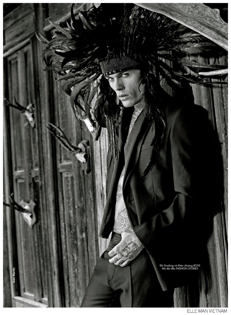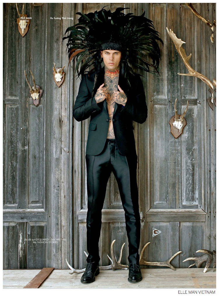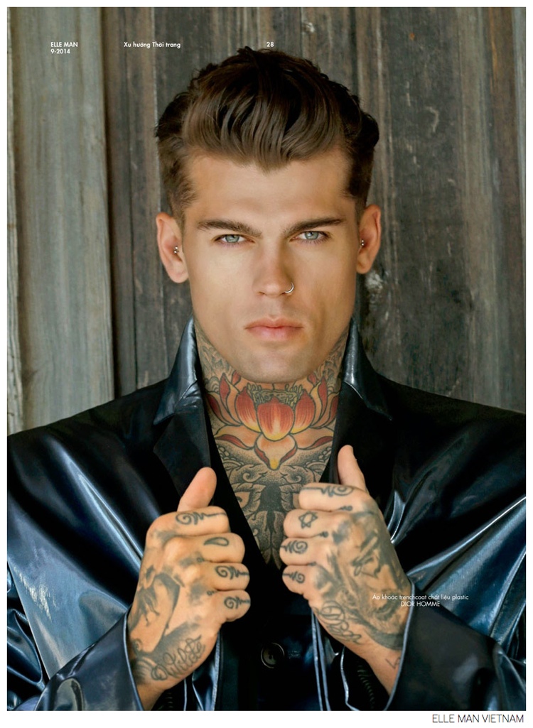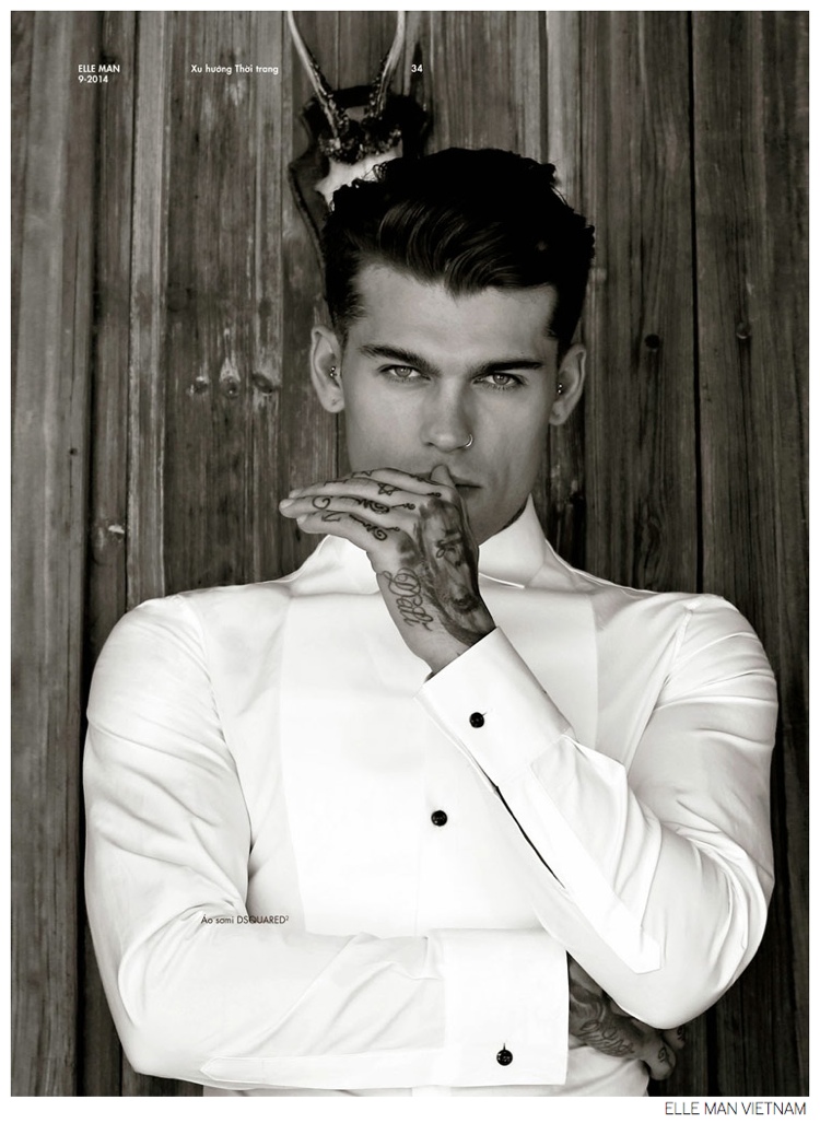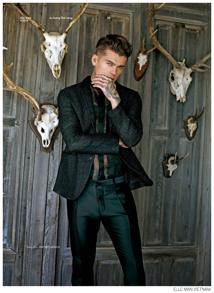 Dark Side-British model Stephen James appears in the September 2014 issue of Elle Man Vietnam, connecting with fashion photographer Juan Alvarez. Sporting a wardrobe with a dark inclination, Stephen models the latest from BOSS by Hugo Boss, Dior Homme, Dsquared2 and other brands, highlighting modern menswear in its tailored form.