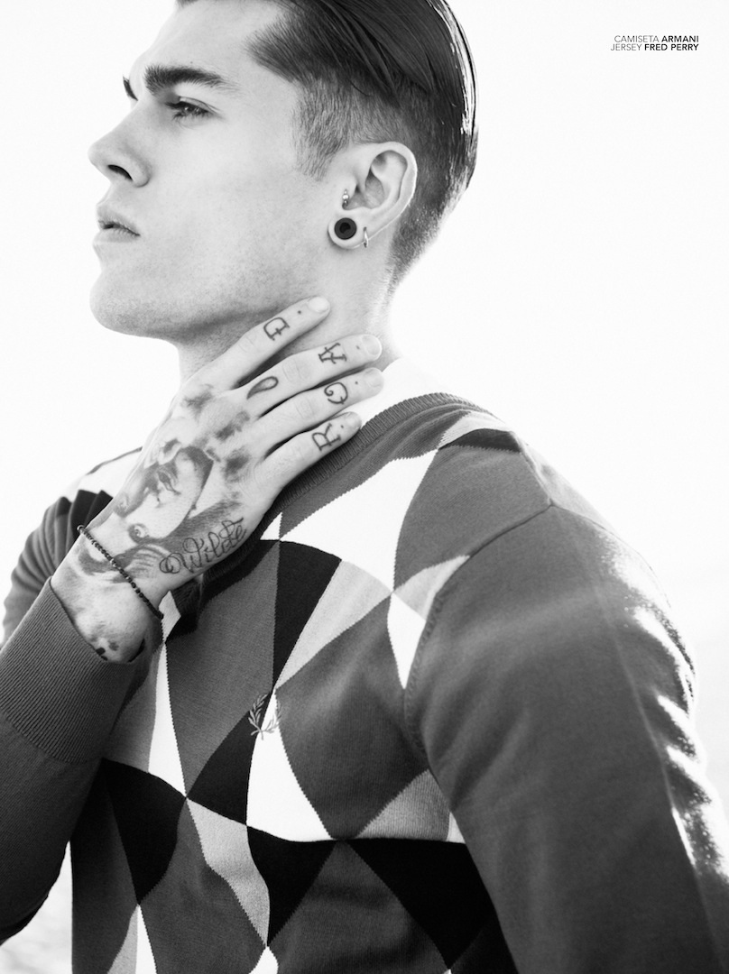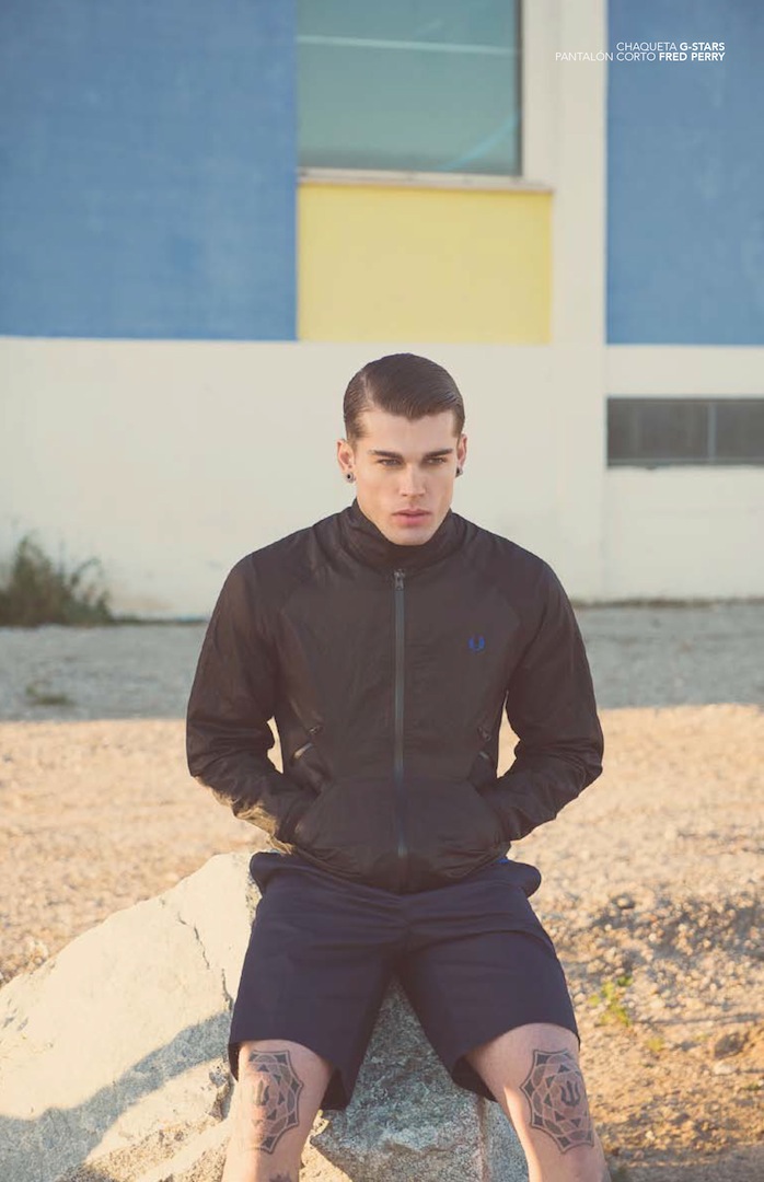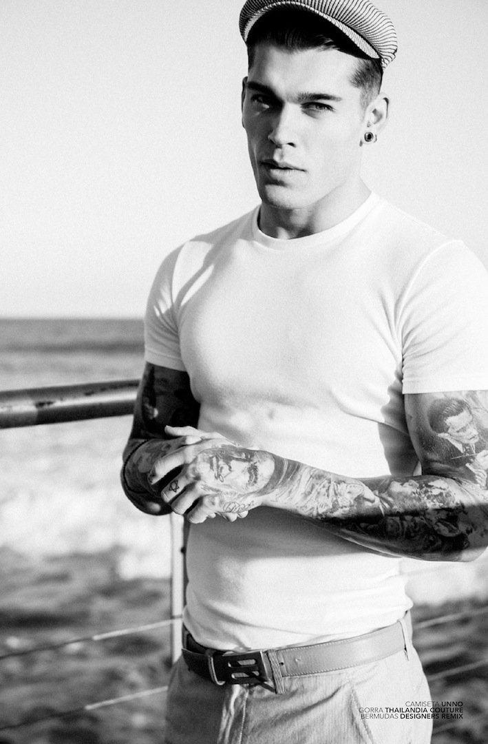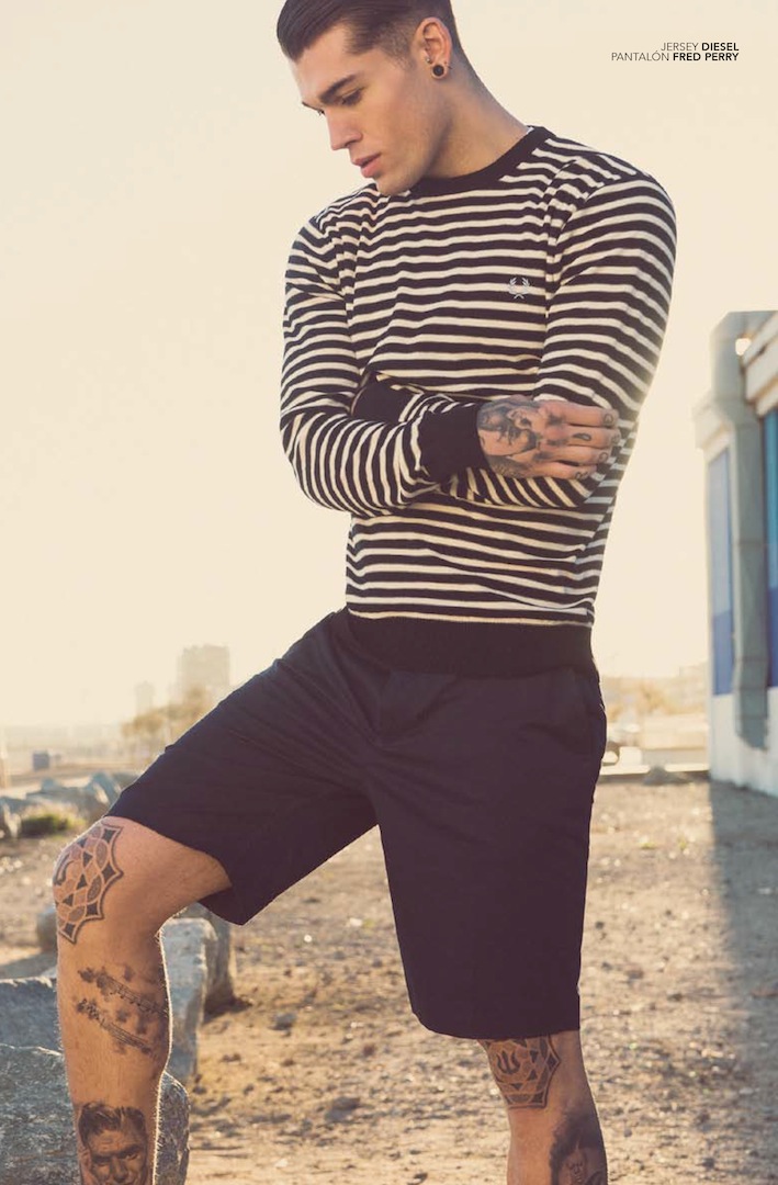 Walking in the Sand–Elite Barcelona model Stephen James spends an afternoon at the beach, posing for Fernando Gómez’s lens for a story featured in Spanish magazine Avenue Illustrated. Clad in striped jumpers and essential polo shirts, paired with classic Bermuda shorts and simple nylon jackets, assembled by Chiqui Peña, Stephen sports refined slicked hair back, that deeply contrast with the countless and rebellious tattoos that decorate his body. / Grooming by Rosa Matilla.