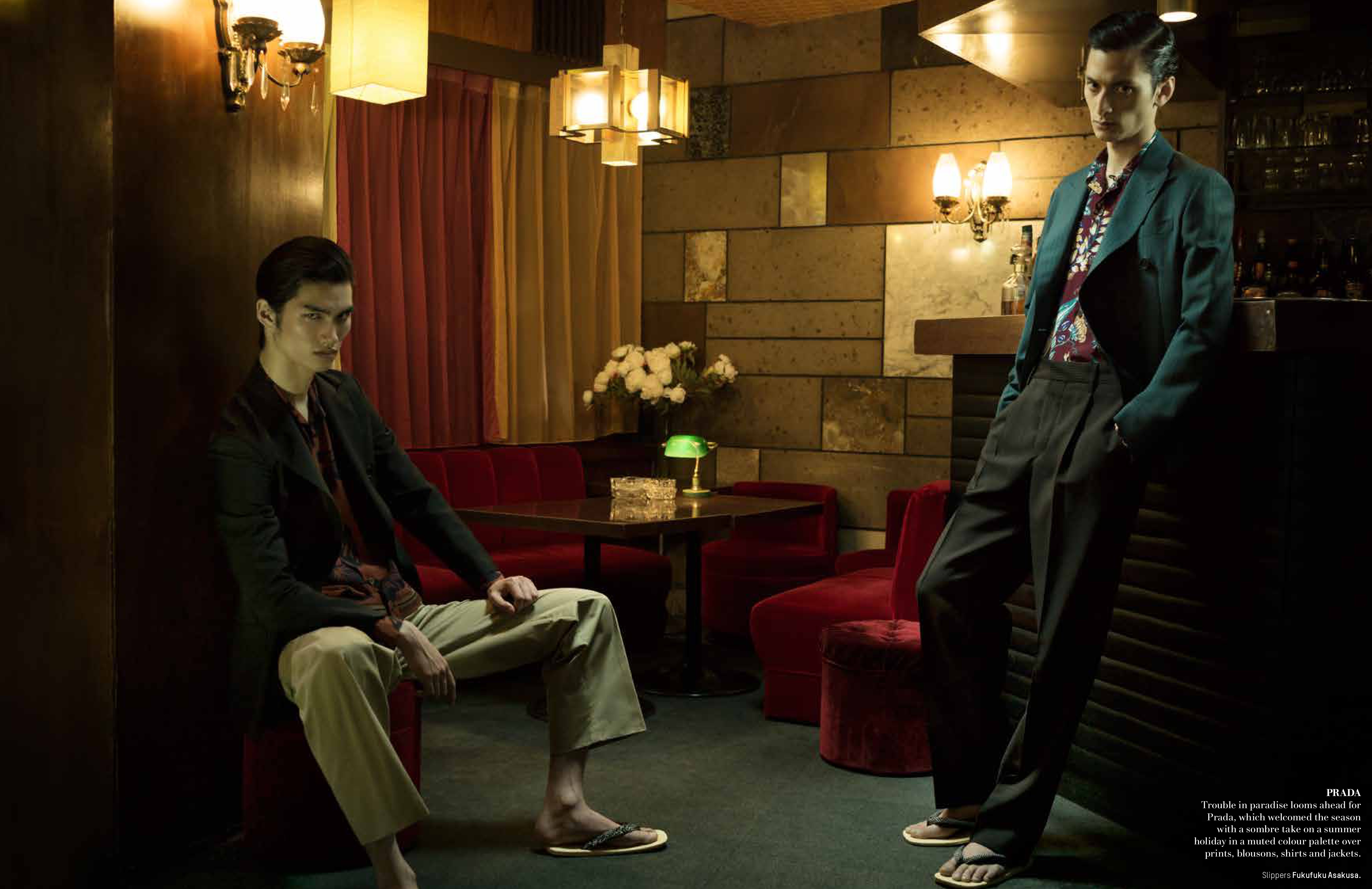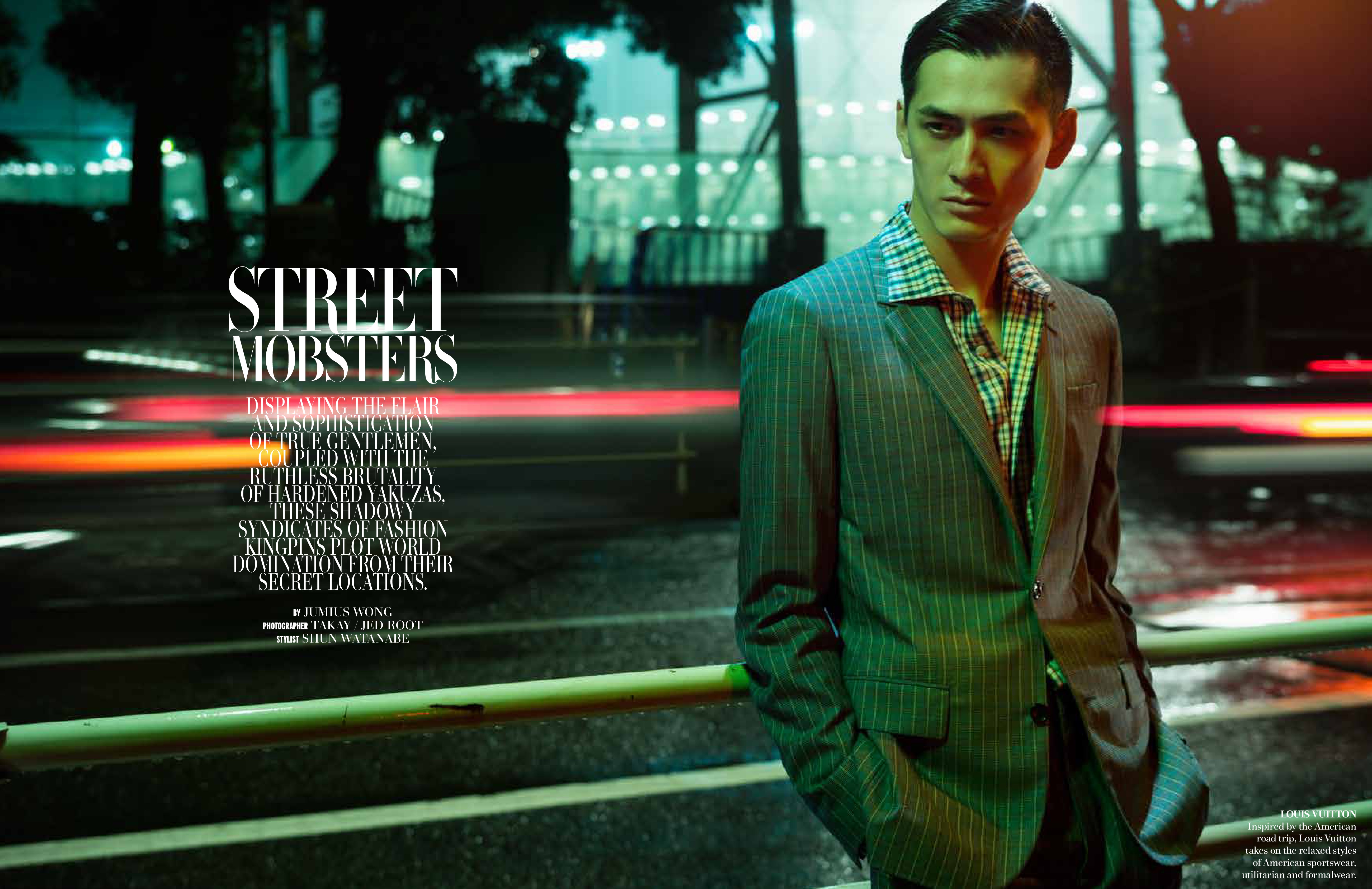 Street Mobsters–Photographer Takay and stylist Shun Watanabe come together for a gangster themed story in the latest issue of L’Officiel Hommes Singapore. Shot in Japan, models Hideki Asahina, Takeshi Uematsu, Takeshi Mikawai, Shohei Yamashita, Kenta Kunai, Ryohei Yamada, Takuya Kurokawa, Shuntaro Yanagi, Takuya Ebihara and Ryu Goda are rounded up for a dark look at mono-designer ensembles. From the lively polka dots of Burberry creative chief officer Christopher Bailey to the elegant lines of Dolce & Gabbana, Watanabe pulls together a luxe outing.
