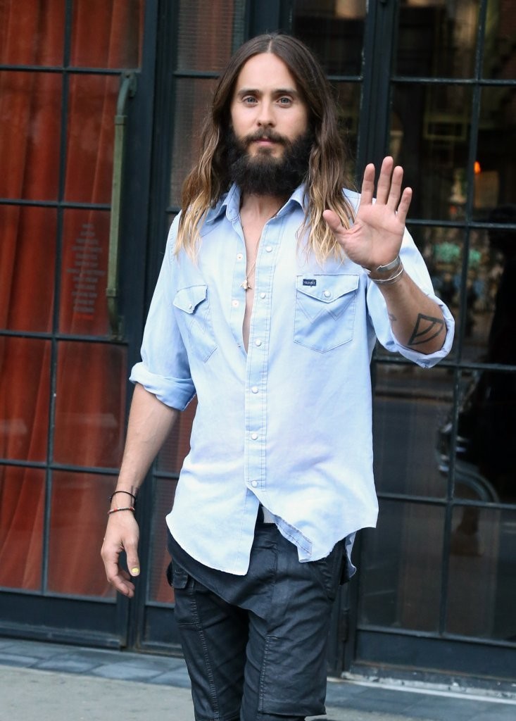 PinJared Leto wears a light washed denim shirt as he heads out to run errands in New York City on August 14th. The Thirty Seconds to Mars frontman pairs his loosely buttoned denim shirt with a pair of fashion-forward pants.