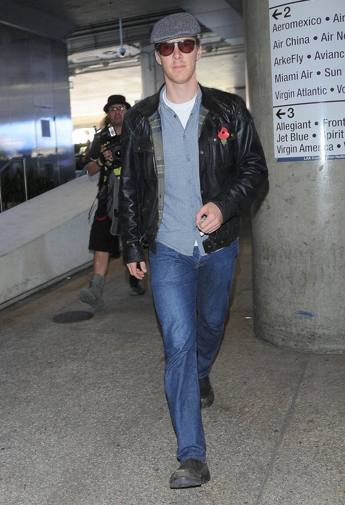 PinSpotted departing LAX on November 7th, Benedict Cumberbatch’s laid-back look included a versatile leather jacket, classic blue denim jeans and a driver’s cap.