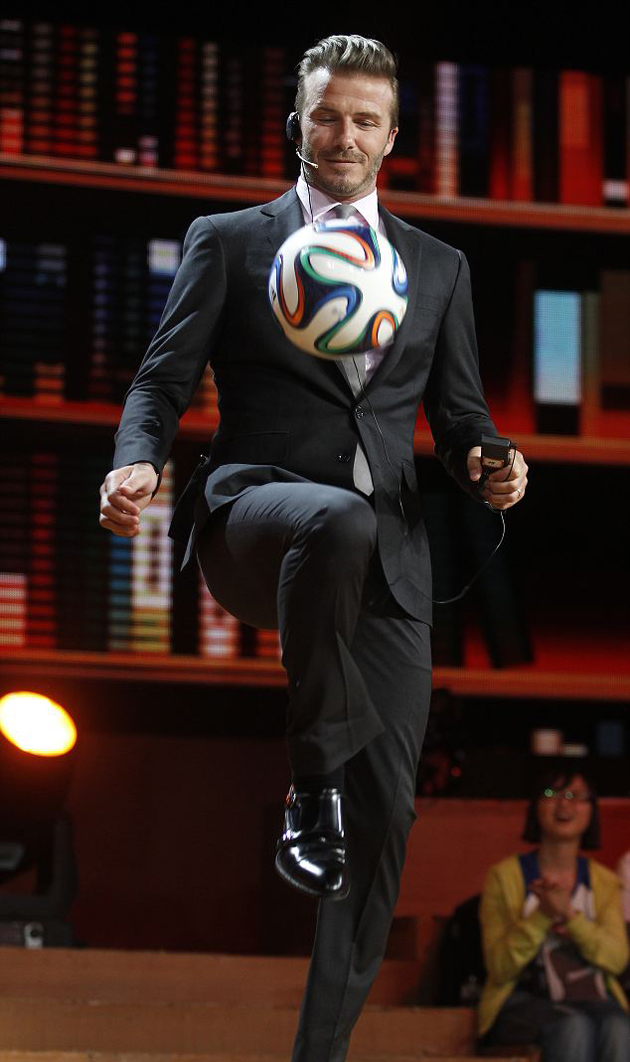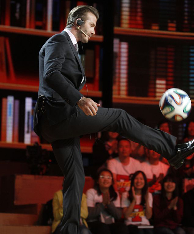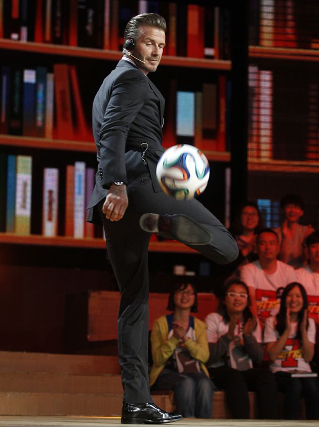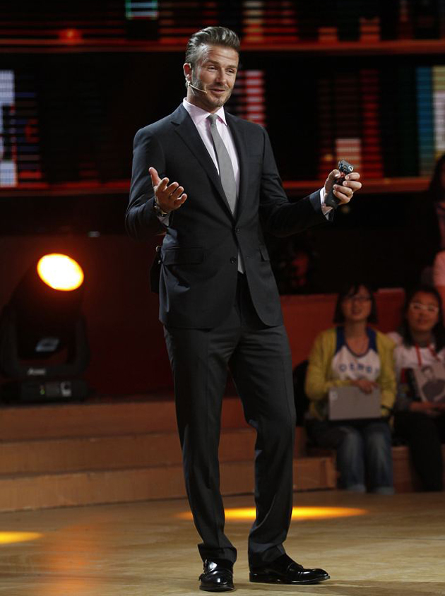 Skillful Tailoring–A globetrotter in demand, David Beckham recently appeared on a taping of China’s edition of The Voice. An example of when embracing classics works, Beckham kept his style strong and tailored with one of his signature black suits, accented with a pink shirt and gray tie. At 6′ 0″, Beckham demonstrates the fantastic results of great tailoring, showing off his football skills in a suit. While in China, Beckham also supported the establishment of the Youth Football Fund.