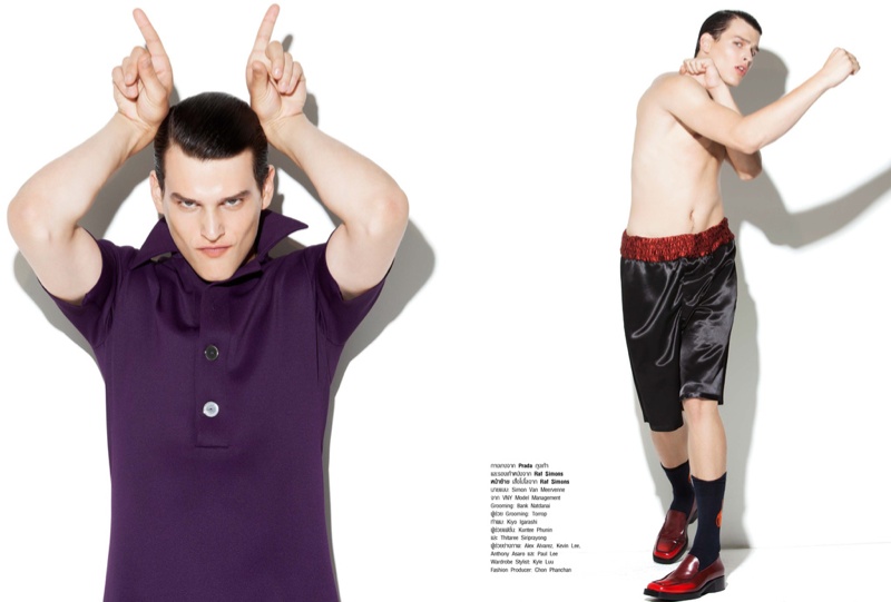 Summer Sunshine–Showcasing looks from Dior Homme, Raf Simons, Prada, Calvin Klein Collection and other luxury labels, Harper’s Bazaar Men Thailand enlists model Simon Van Meervenne for its latest summer outing. Joining photographer Natth Jaturapahu and stylist Nichakul Kitayanubhongse in the studio, Simon poses for cheeky images as he displays a fashionable twist to casual ensembles.