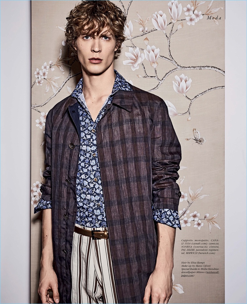 Front and center, Sven de Vries wears a jacket and pants by Salvatore Ferragamo. The Dutch model also sports a Xacus shirt with Santoni moccasins and a Fedon bag.