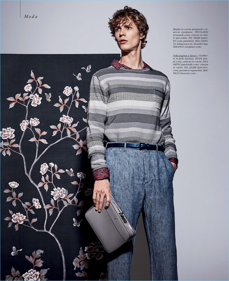 Luigi Gaballo outfits Sven de Vries in a sweater and trousers by Emporio Armani. Sven also wears an Italo Ferretti shirt with a Giorgio Armani belt.