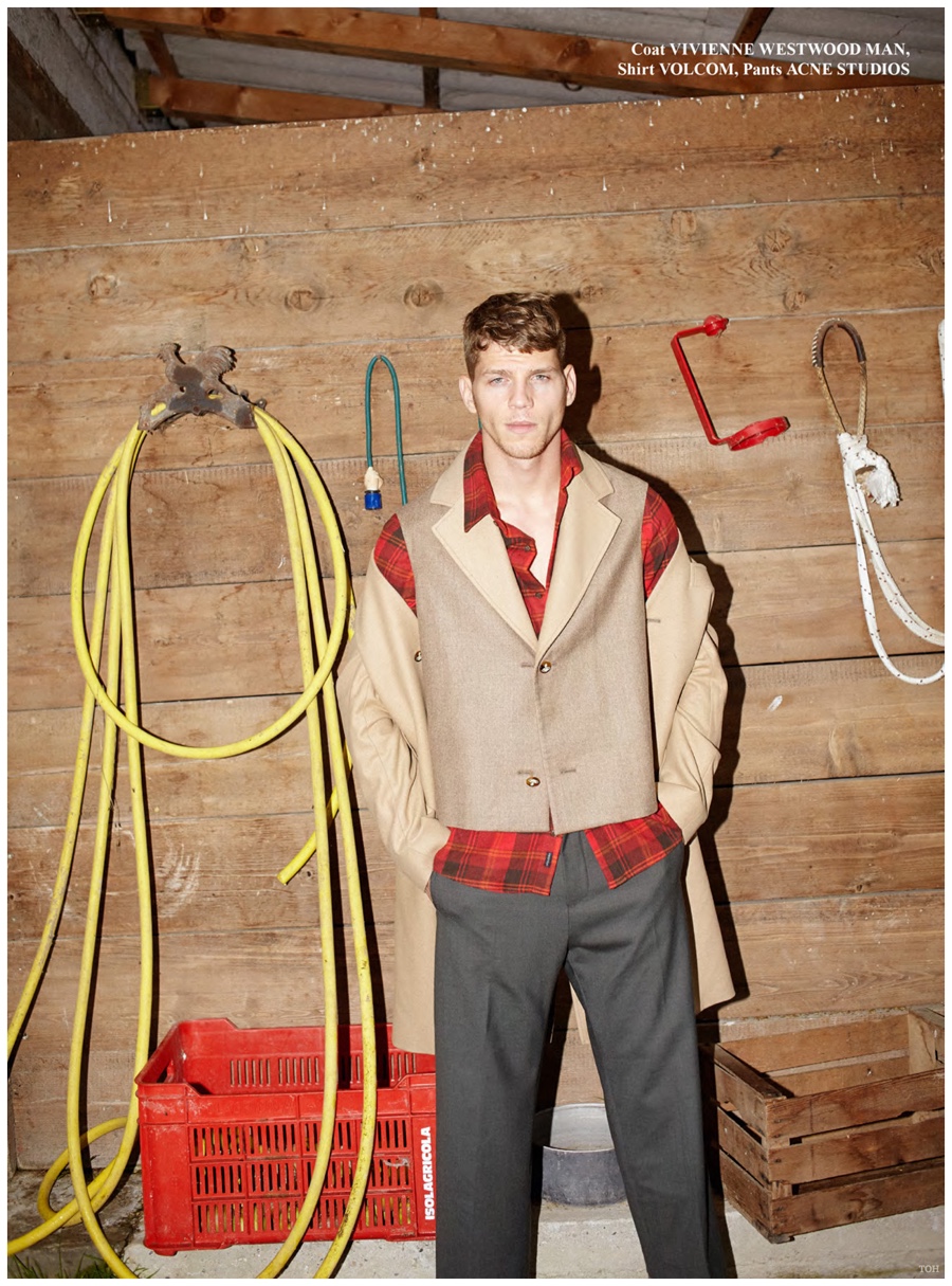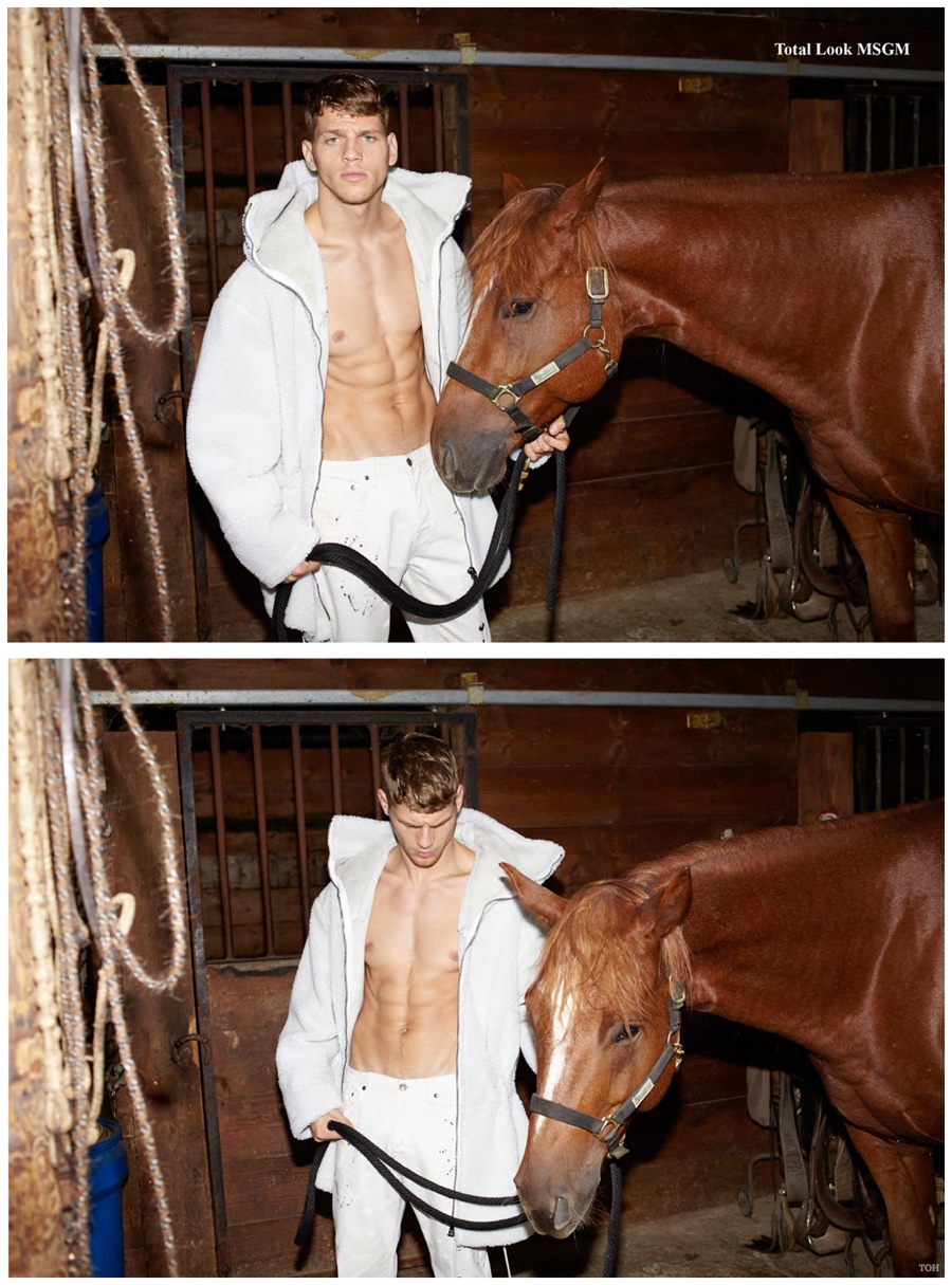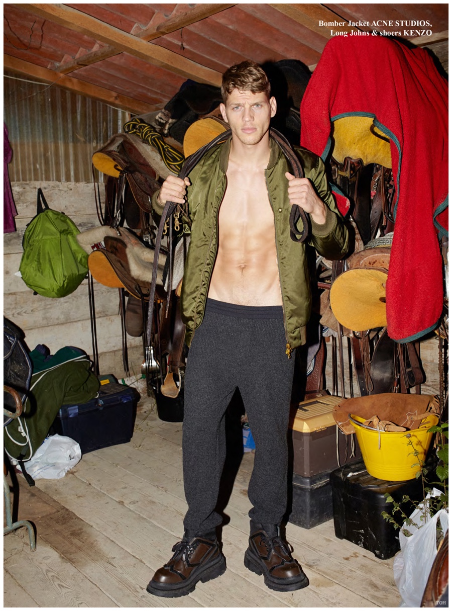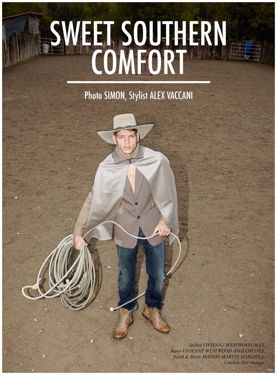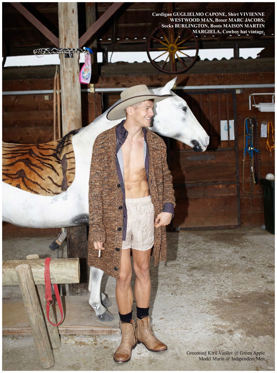 Photographer Simon and fashion editor Alex Vaccani collaborate once again on a shoot for TOH magazine. Honing in on a western theme, Independent Men model Marin is enlisted as the duo’s cowboy. Shot in a barn, Marin sports casual styles, fit for a fashion savvy cowboy, with looks from Acne Studios, Maison Martin Margiela, Kenzo and more. / Grooming by Kiril Vasilev.