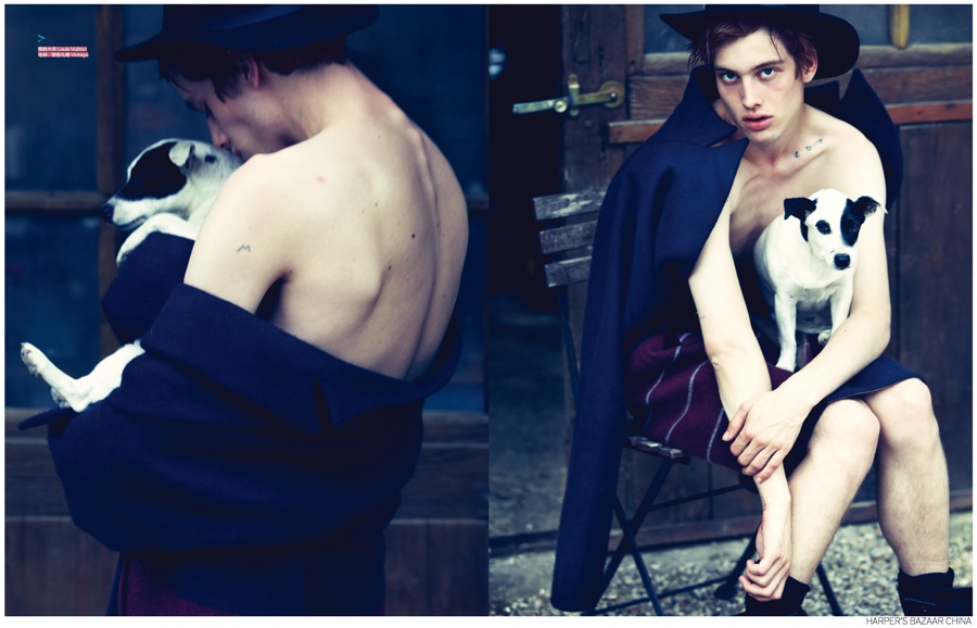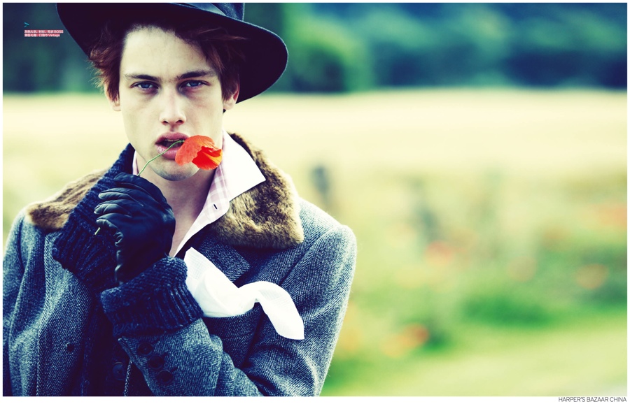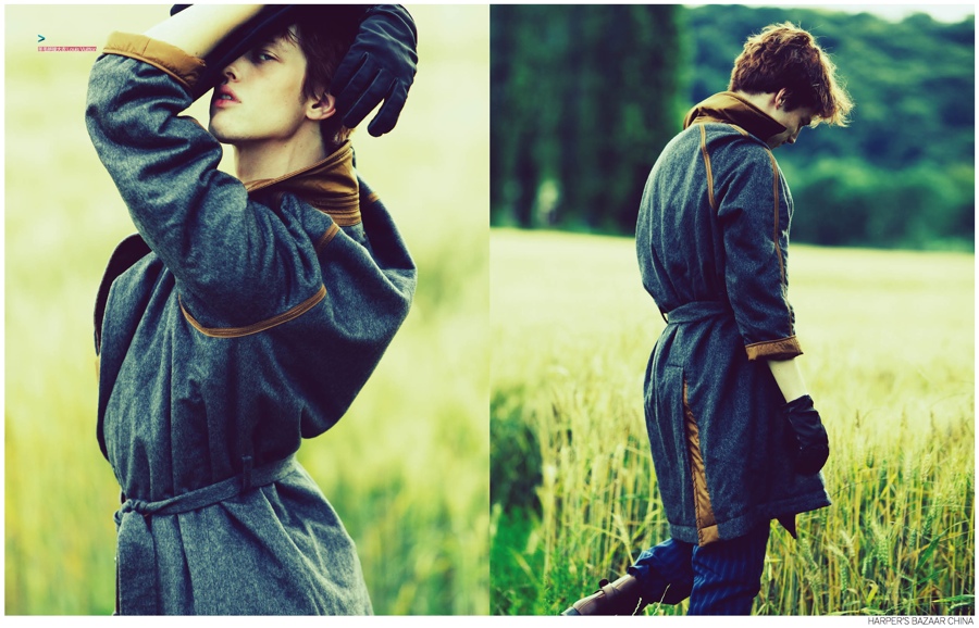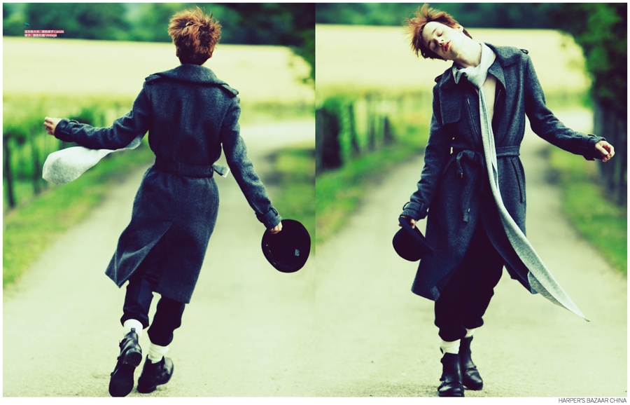 Fashion and the Tramp-Model Sylvester Ulv graces the pages of Harper’s Bazaar China’s September 2014 issue with a charming story that brings to mind images of Charlie Chaplin and his portrayal of The Tramp. Photographed outdoors by Hai FENG, Sylvester’s graceful movement is highlighted as he strikes several arresting poses. Dressed in oversized coats and loose proportions, Sylvester is styled with a romantic spirit by Vincent Young.