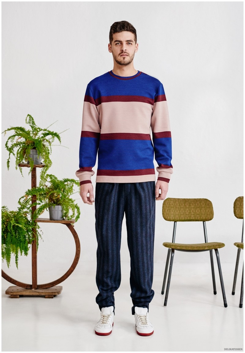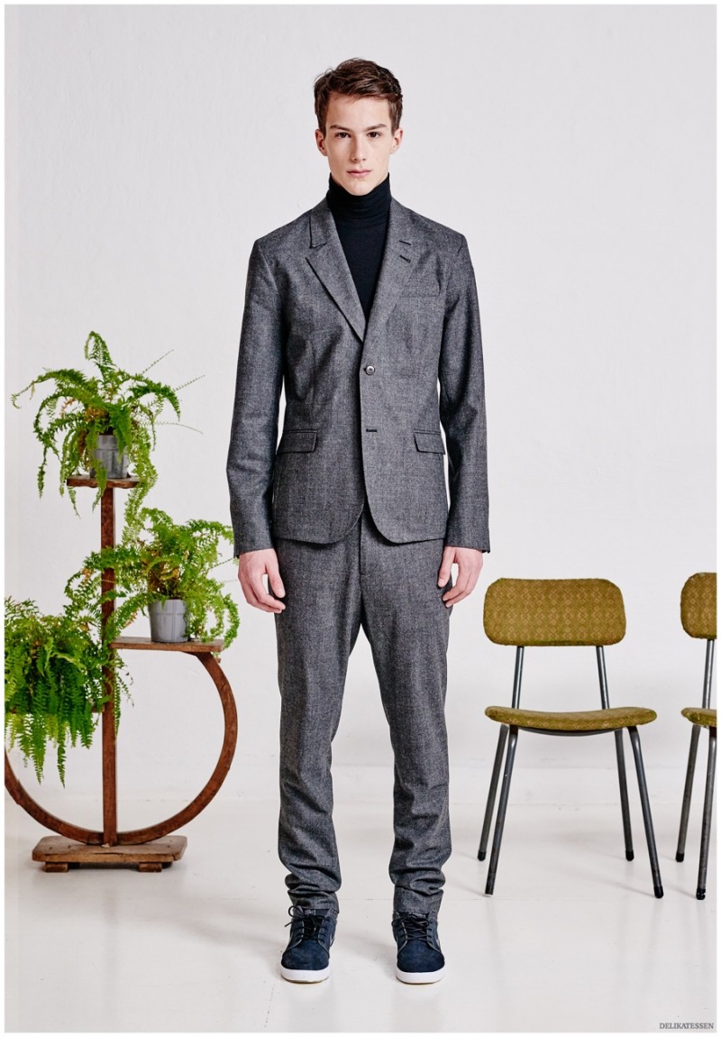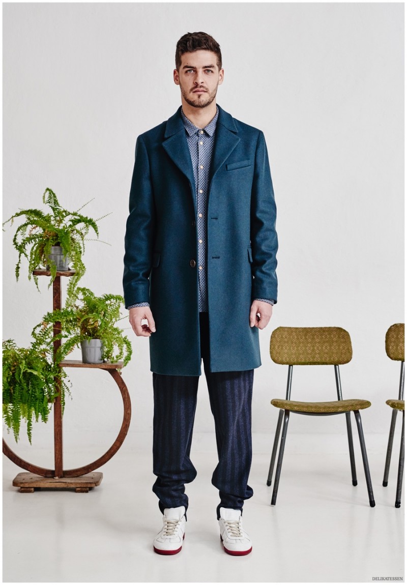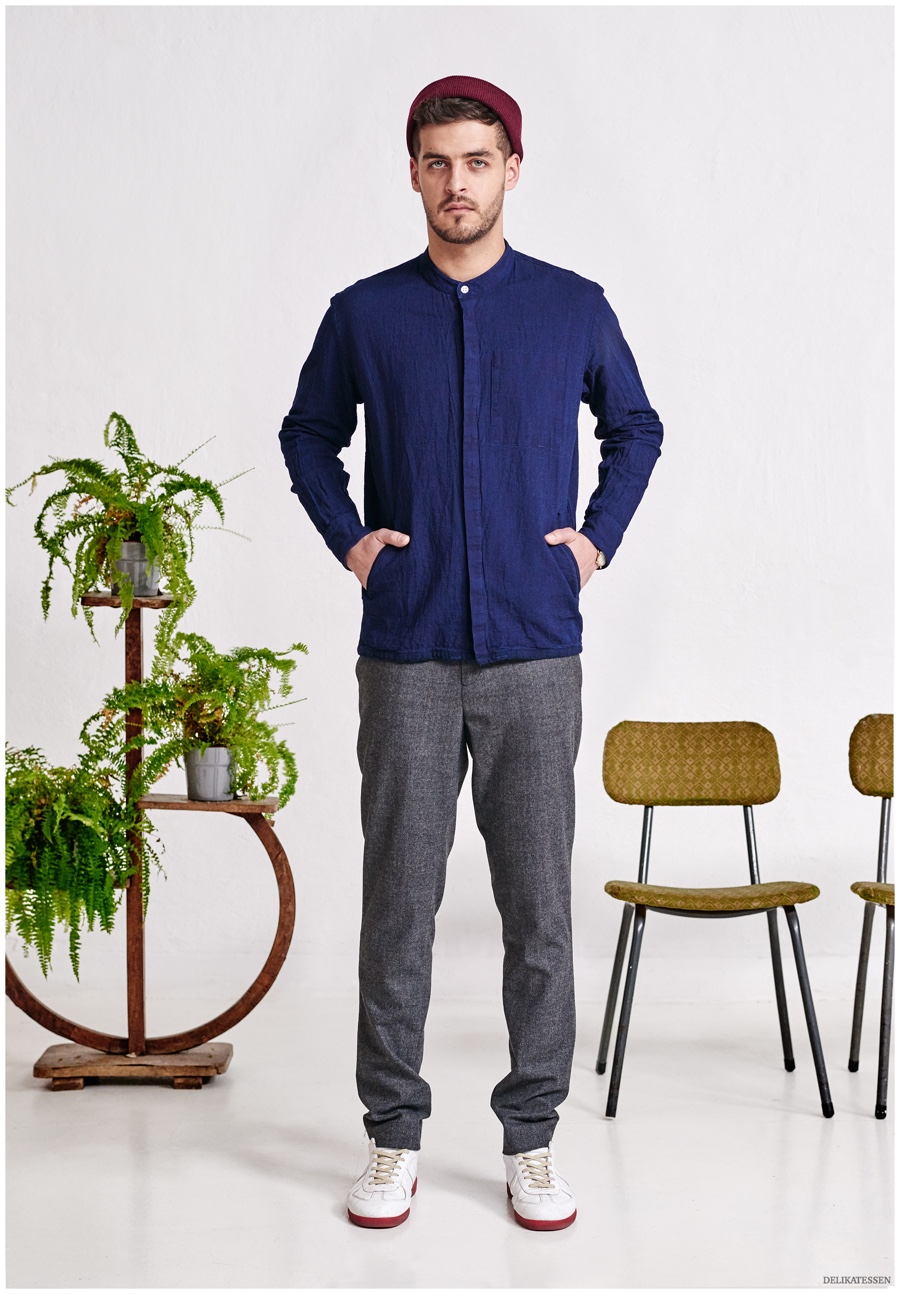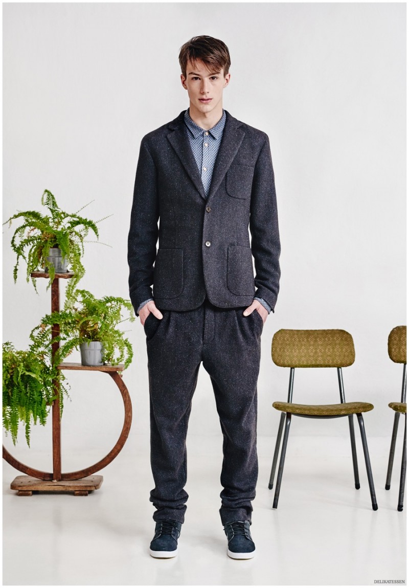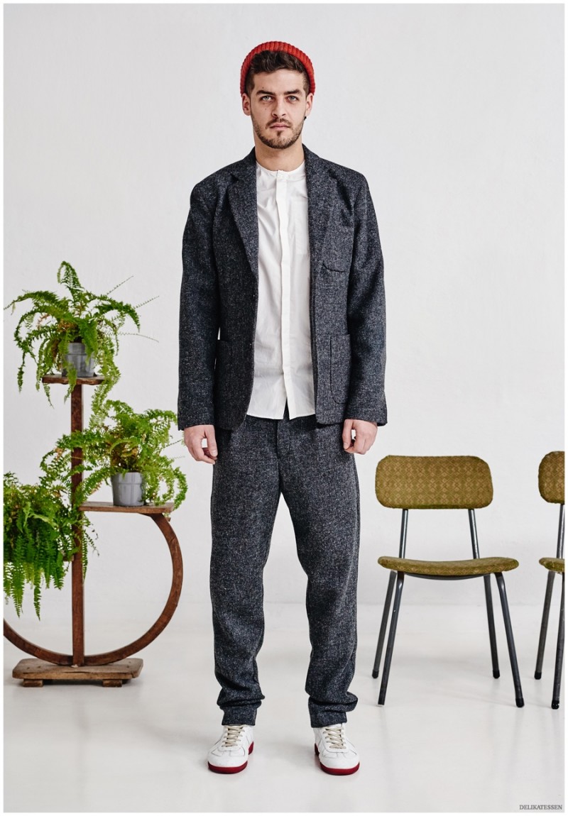 No stranger to rustic references, Amsterdam-based fashion brand Delikatessen found the inspiration for its fall-winter 2015 collection in balsamic vinegar produced by the families of Aceto Balsamico Tradizionale. Honing in on the rich deep brown color of balsamic vinegar and the wood from casks, Delikatessen brings an interesting dimension to textures for the new lineup. Approaching the collection with relaxed silhouettes to reflect a simple lifestyle, the brand serves up knitwear, trousers and other separates, speckled with somber prints and a workwear attitude, highlighted in pieces such as the shirt jacket.