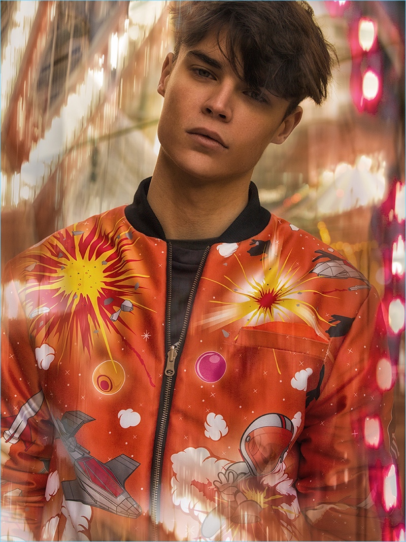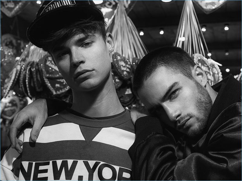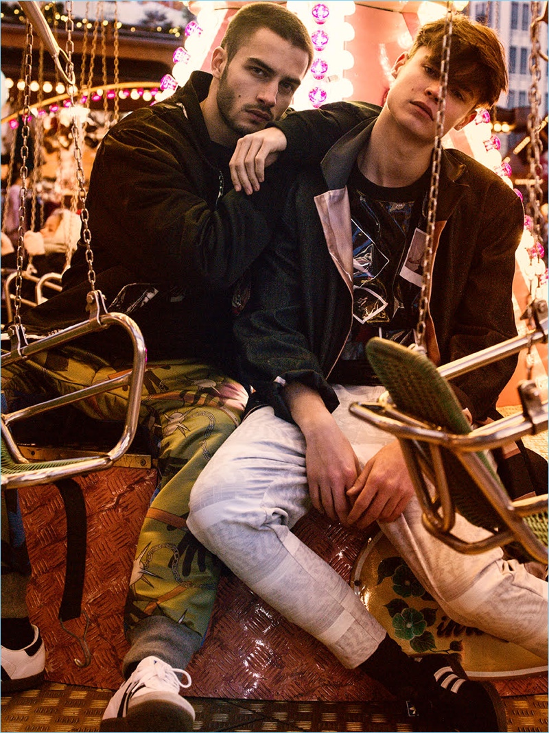 Together, Justin and Aleksandar wear fashions from the spring-summer 2017 collection of London-based brand, TZUJI. The fun lineup takes inspiration from the electronic music and club scene as evidenced by bright splashes of color and interesting fabrics.