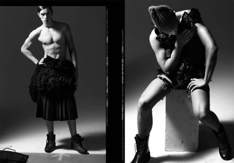 Rubber tubed accessories from Antonio Urzi for Sex Sade are highlighted in the recent editorial from photographer Massimo Pamparana. The perfect accent to Pamparana’s moody yet adventurous shoot, stylist Ivan Bontchev achieves a playful mix of bondage-inspired gear and bold outfitting choices that coincide well when worn by Oscar Spendrup and Brazilian favorite Francisco Lachowski.