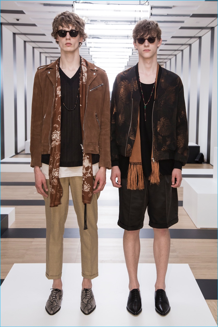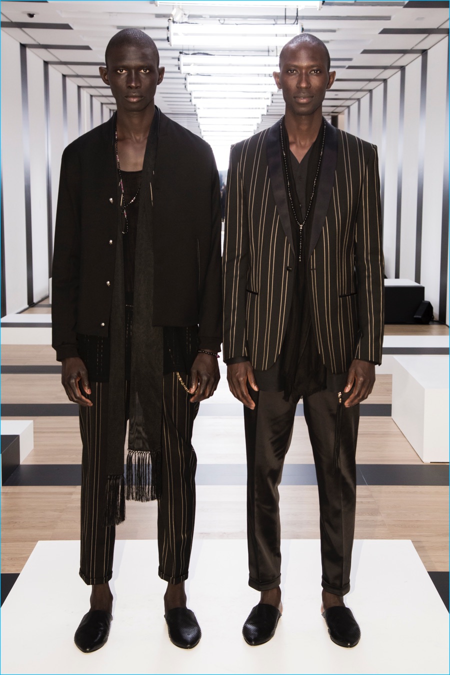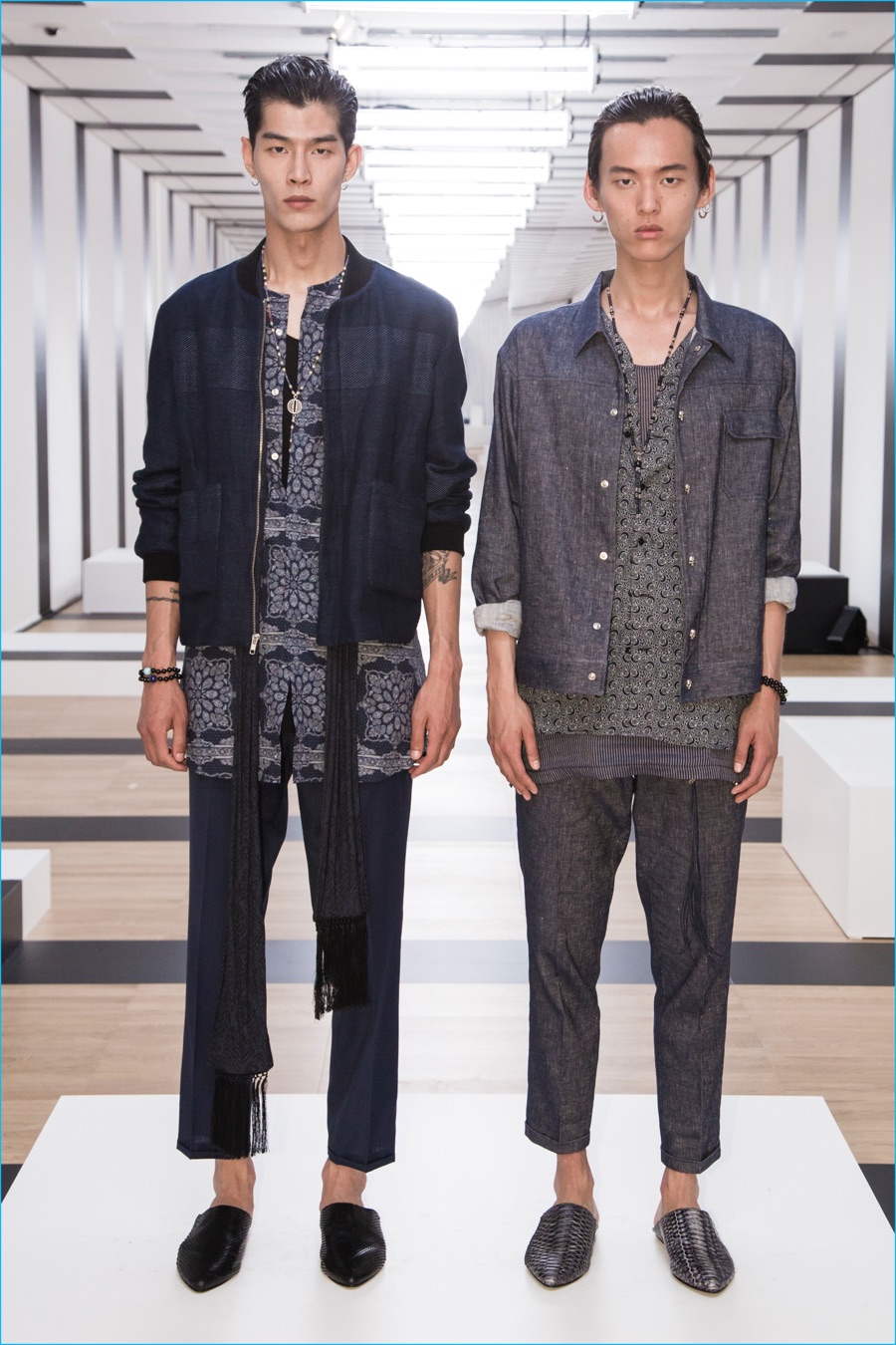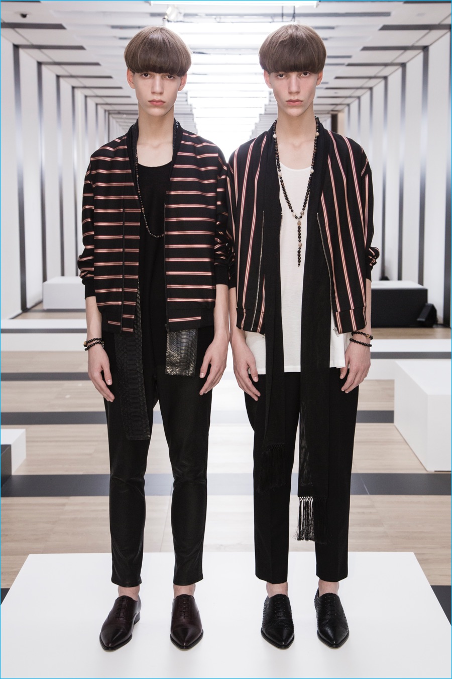 Borrowing from Ahluwalia’s personal style, the range was infused with rich colors, intricate prints and an effortless approach to elegant dress. Taking its tailored silhouettes and loosening them up for a soft redirection, The Kooples found inspiration in Indian tunics. The chic style offered an alternative to the formal dress shirt. Taking aim at details that blend day and night, the label mixed various prints and proportions, achieving romantic layers. Stripes, polka dots and more patterns came together as The Kooples injected the lineup with a rock ‘n’ roll attitude. Details included a skull buttoned silk tunic as well as leather Babouche slippers.