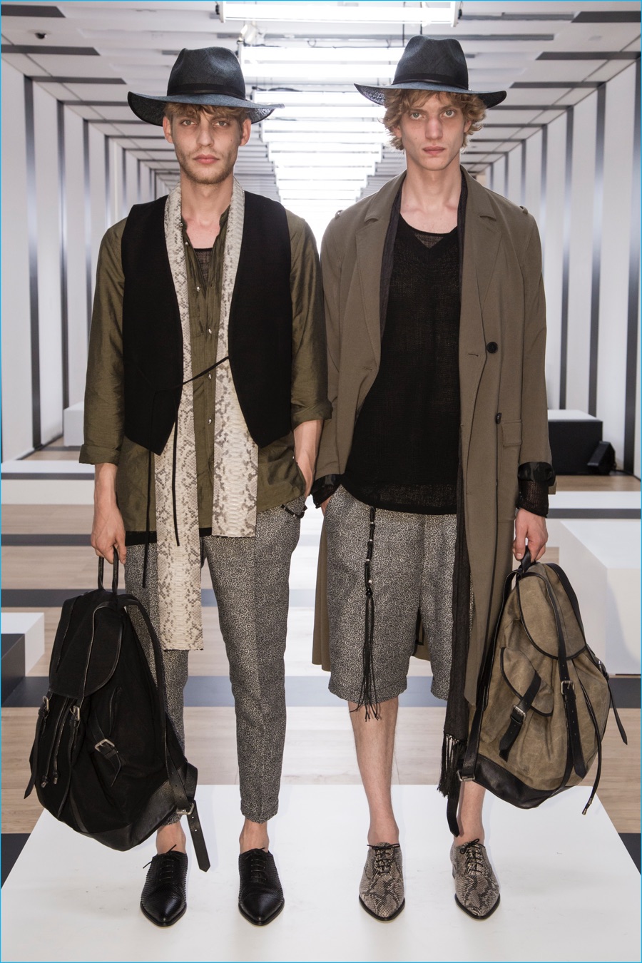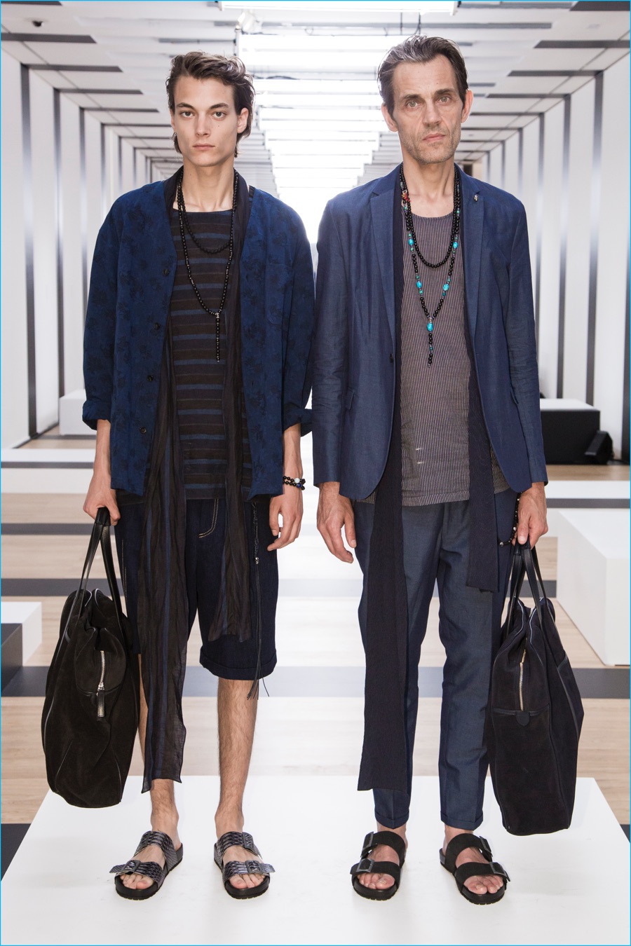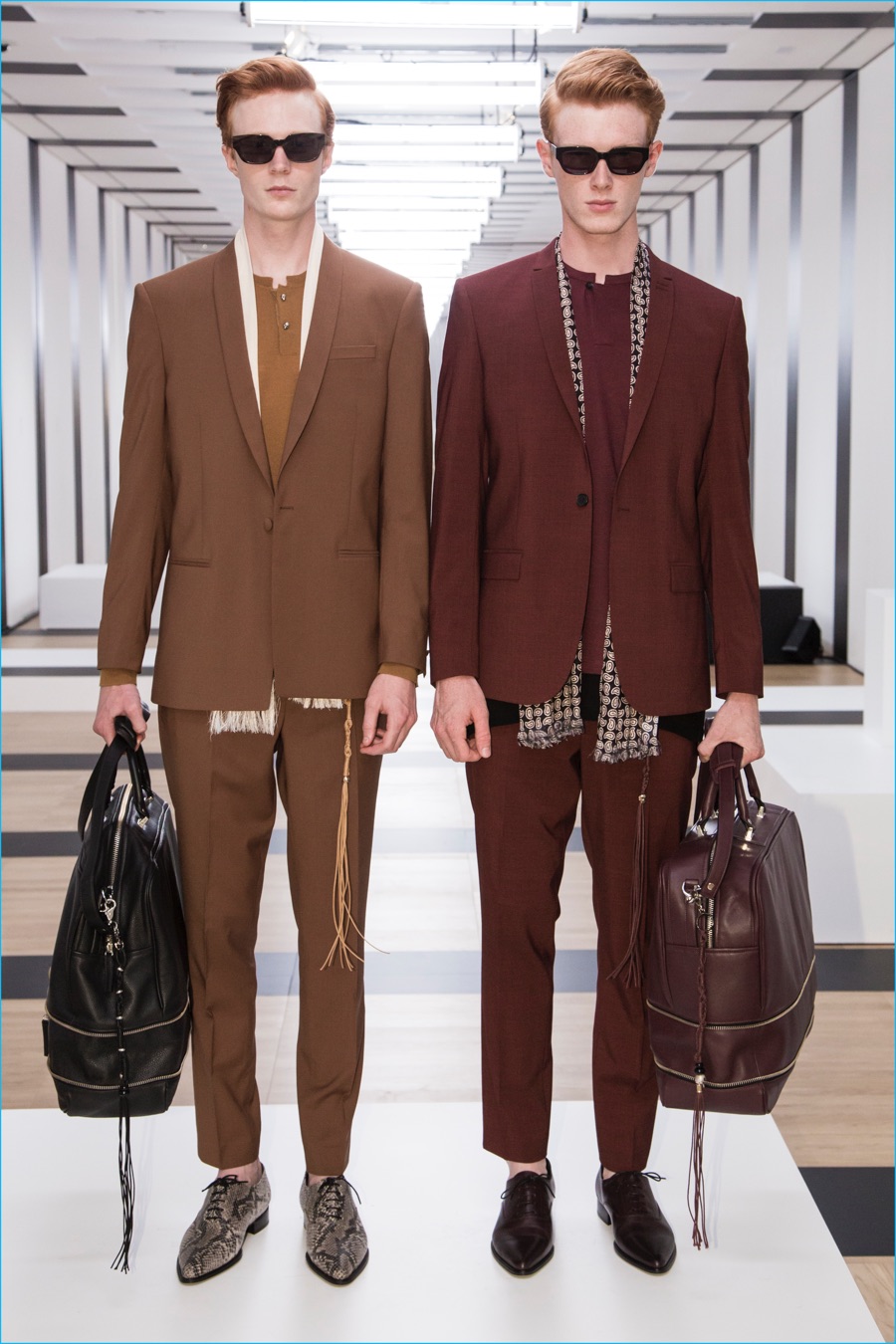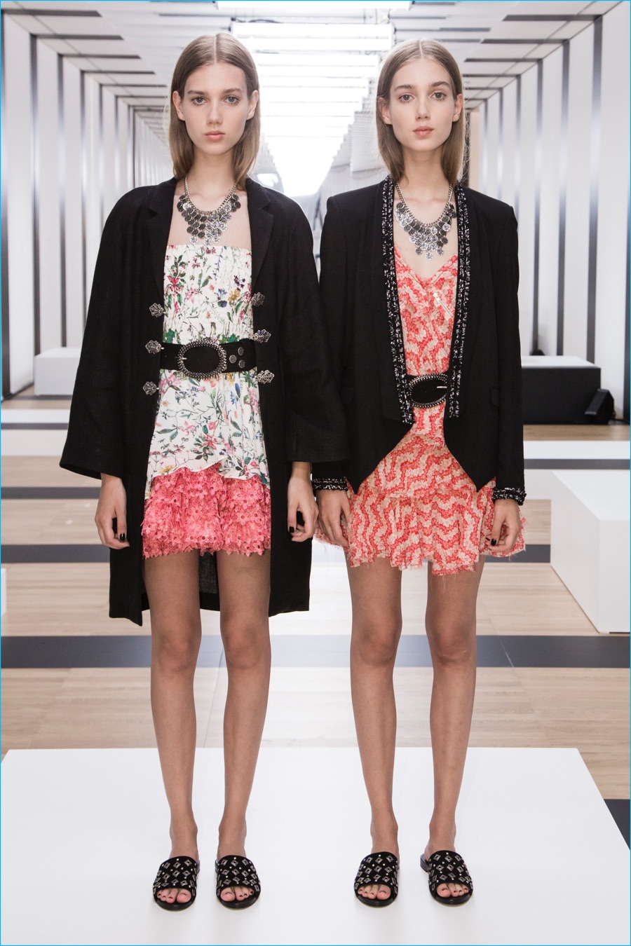 Borrowing from Ahluwalia’s personal style, the range was infused with rich colors, intricate prints and an effortless approach to elegant dress. Taking its tailored silhouettes and loosening them up for a soft redirection, The Kooples found inspiration in Indian tunics. The chic style offered an alternative to the formal dress shirt. Taking aim at details that blend day and night, the label mixed various prints and proportions, achieving romantic layers. Stripes, polka dots and more patterns came together as The Kooples injected the lineup with a rock ‘n’ roll attitude. Details included a skull buttoned silk tunic as well as leather Babouche slippers.