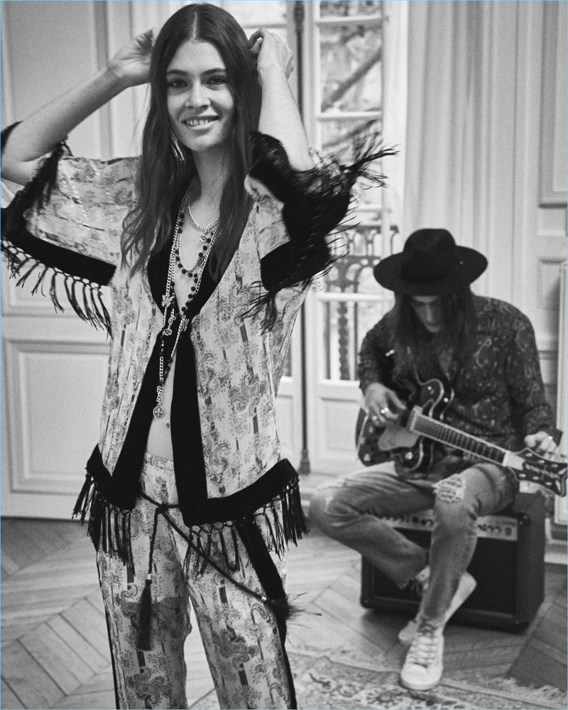 Heading into summer, The Kooples invites us on a Bohemian journey. The French label looks to a mix of California hippy-chic style and Eastern influences for its Sunrise capsule collection. Giving life to the eclectic offering, Alphonse Emery and Mia Quinn come together. The pair wears a wardrobe decorated with Bohemian-inspired patterns. Here, paisley, geometric, and floral prints flourish. Alphonse embodies the cool attitude of The Kooples in skinny ripped jeans, patterned shirts, and chic jackets.