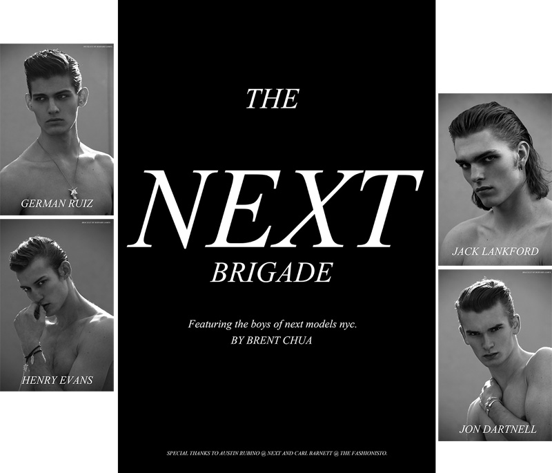 The Next Brigade–Armed with his camera and thirty minutes for each model, photographer Brent Chua dedicates a day to several promising boys from Next. Captured with a clean beauty portrait and a selection of styled shots, Ryan Mertz, Henry Evans, Jack Lankford, German Ruiz, Jon Dartnell and Laurence McCrea each get their special moment.