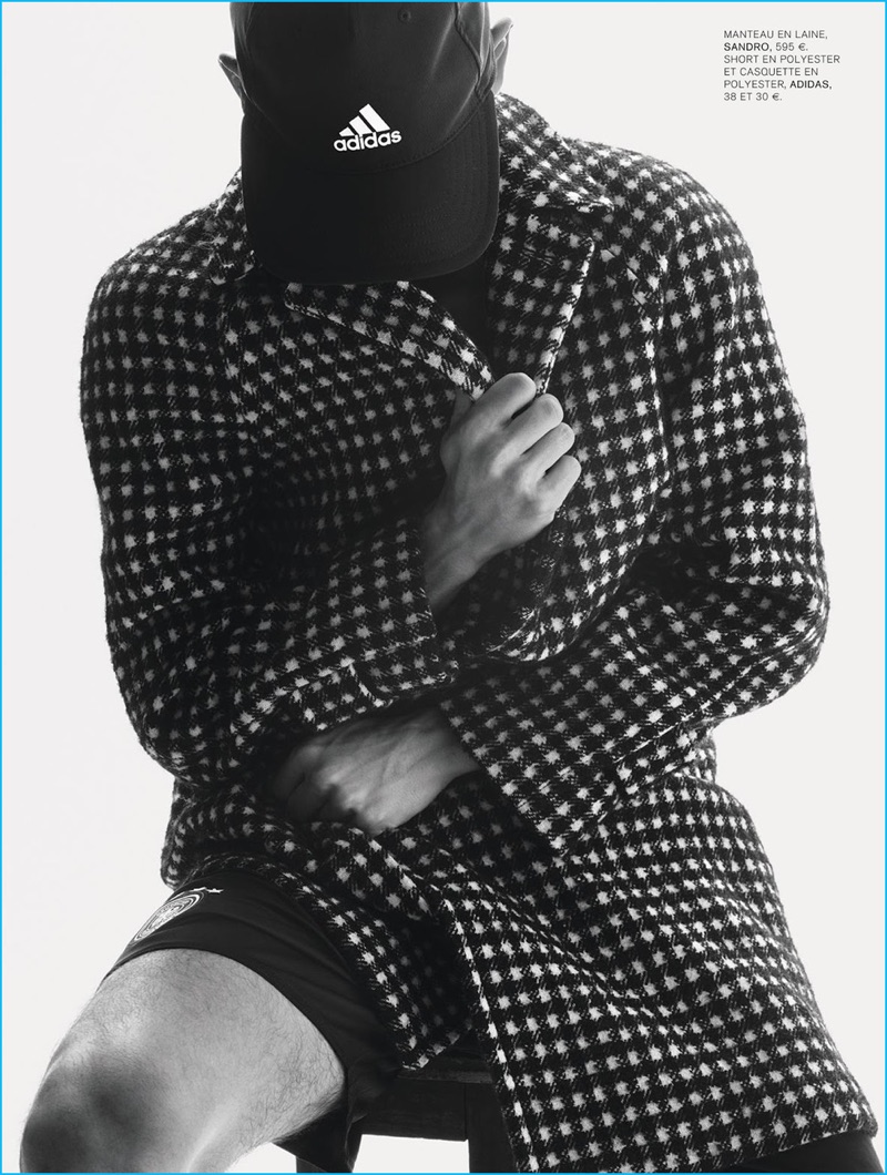 PinThibaud Charon models a collision of styles with a Maison Margiela blazer, Eric Bompard sweater, Ermenegildo Zegna Couture shirt, Adidas shorts, and Pierre Hardy sneakers.PinL’Express Styles highlights a choice black and white gingham print coat from Sandro.