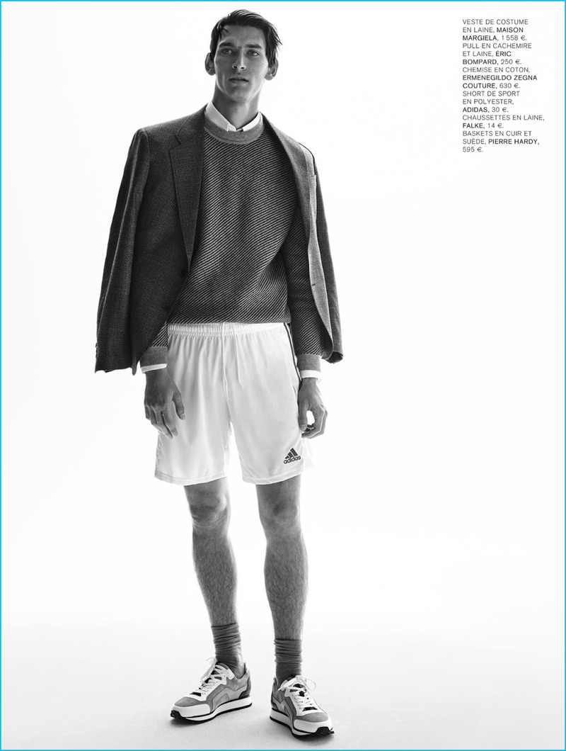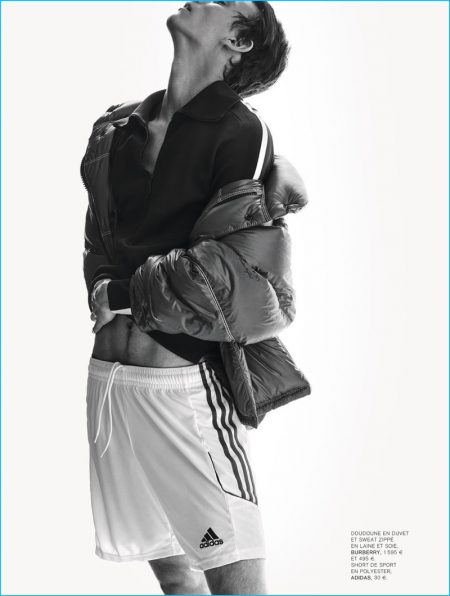 L’Express Styles delivers a sporty fashion narrative with a quirky pairing of aesthetics for fall. Photographer Raf Stahelin heads to the studio with model Thibaud Charon for the occasion. Stylist Isabelle Thiry paints a youthful picture for the editorial. Here, standout designer pieces from brands such as Prada and Ermenegildo Zegna Couture occupy a new context. Clothes for the complex style personality, tailored coats and cashmere knits find common ground with active apparel.