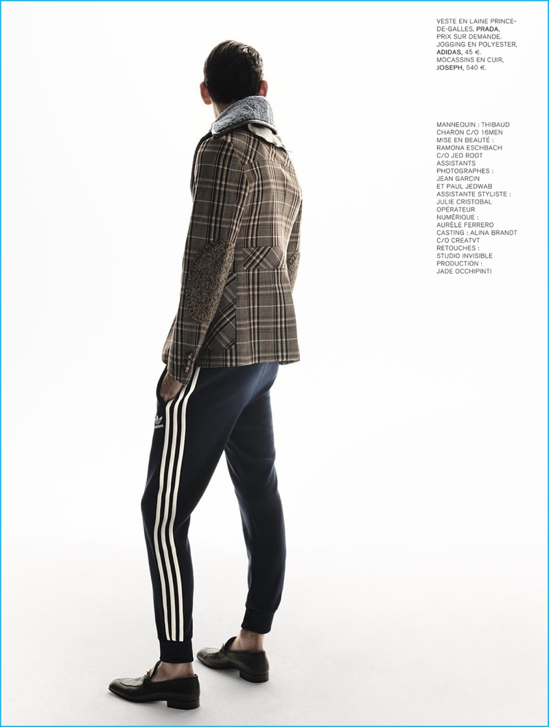 PinRaf Stahelin photographs Thibaud Charon in a plaid Prada jacket, paired with Adidas joggers and Joseph leather dress shoes.