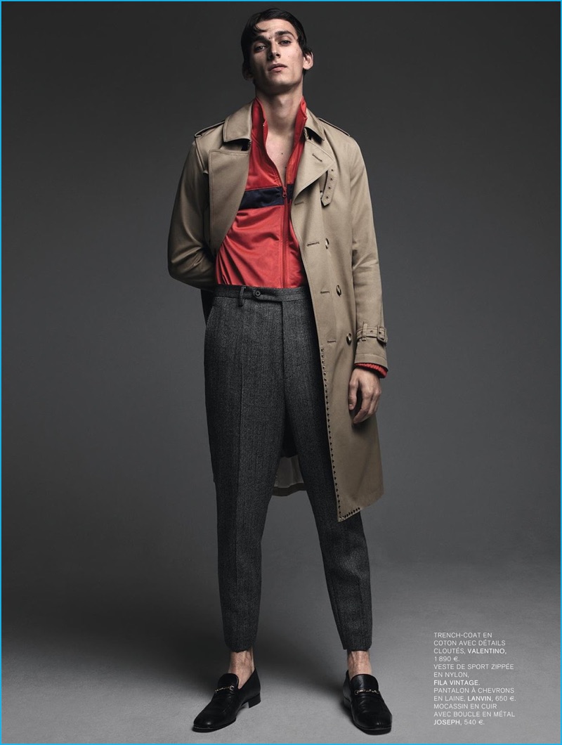 PinStanding tall, Thibaud Charon models a Valentino trench coat with a vintage Fila track jacket, Lanvin trousers, and Joseph dress shoes.